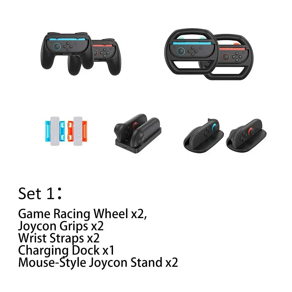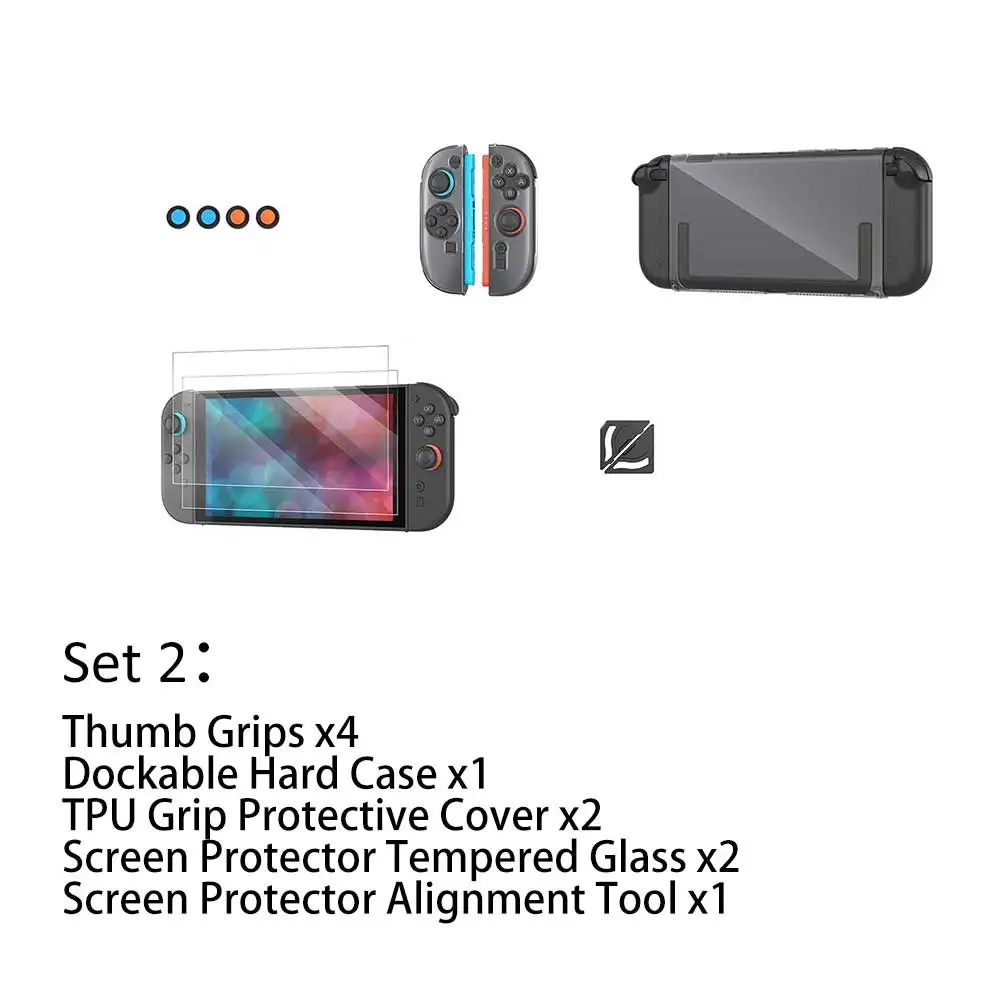 Su kit completo de accesorios para Switch 2 incluye: estuche de transporte x1, empuñaduras para el pulgar x4, rueda de carreras de juegos x2, empuñaduras Joycon x2, correas para las muñecas x2, base de carga x1, soporte Joycon estilo mouse x2, estuche rígido acoplable x1, mango de TPU Cubierta protectora x2, Protector de pantalla de vidrio templado x2, Herramienta de alineación del protector de pantalla x1.Este paquete de accesorios todo en uno con interruptor 2 protege su Switch 2, se carga más rápido, se agarra de manera más inteligente y libera todo el potencial de juego en todos los género, listo para cualquier aventura.