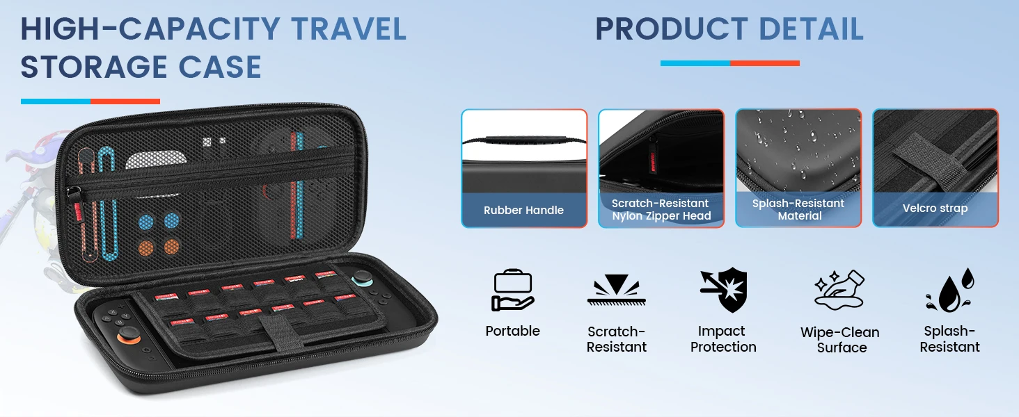 【Protección completa de viaje de Nintendo Switch 2】Proteja su consola Nintendo Switch 2 en nuestro estuche de transporte Switch 2 con resistente construcción de EVA.La carcasa reforzada resiste impactos y derrames, mientras que los dientes con cremallera de nailon a prueba de rayones protegen la consola y los Joy-Cons.En el interior, los bolsillos de malla organizan las empuñaduras para el pulgar del Switch 2, las muñequeras, los auriculares, los cables del cargador del Switch 2, el banco de energía, etc., con un tarjetero dedicado de 12 ranuras que asegura su biblioteca de juegos.Las cremalleras dobles + el asa de silicona hacen que este estuche de viaje Switch 2 sea portátil sin esfuerzo.
