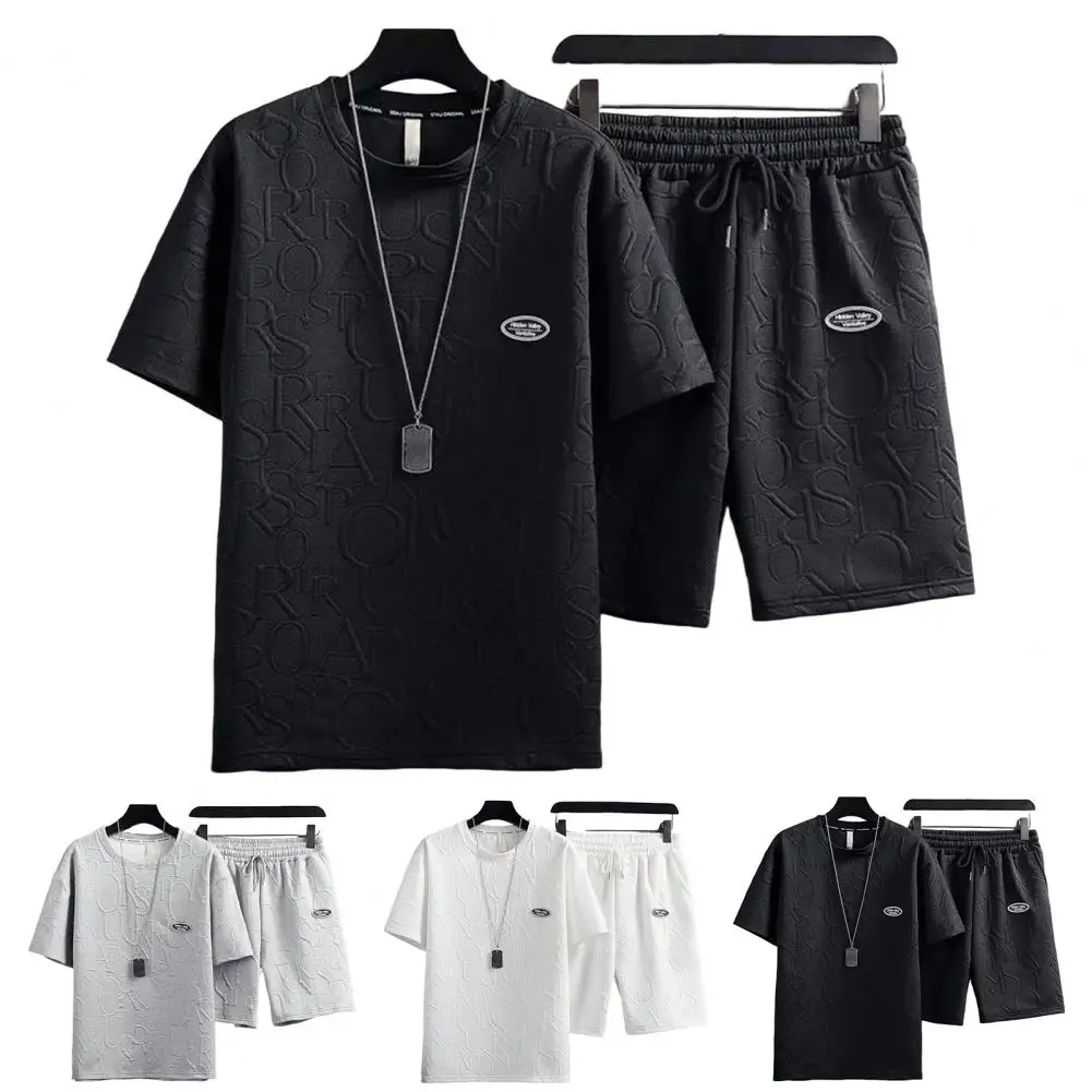 Comprar Conjunto de camiseta y pantalones cortos para hombre, camiseta de manga corta con cuello redondo, Color sólido, verano, ejercicio, 2 unidades