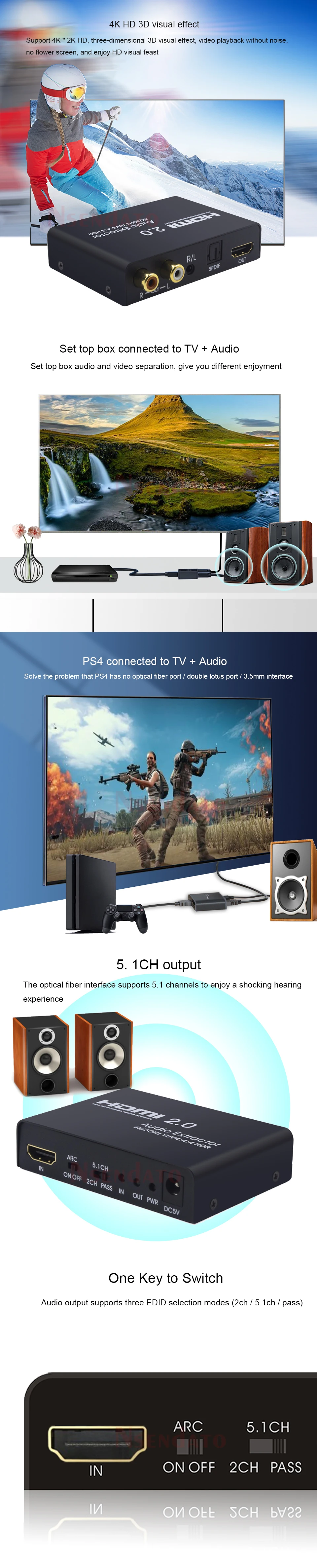 Descripción general:Este es un extractor de audio HDMI multifuncional de alto rendimiento, este extractor puede extraer la señal de audio entre la señal HDMI al sistema amplificador de potencia para obtener efectos de audio de alta calidad que es difícil de lograr para los altavoces de TV.Características:Compatible-HDMI 2.0b (18Gbps), compatible con HDCP 2,2Resoluciones de vídeo de hasta 4K @ 60Hz (YUV4:4:4)Extrae audio HDMI a audio óptico multicanal (SPDIF) o auriculares de 3,5mm/audio analógico RCAEl audio óptico admite LPCM 2CH, Dobly Digital 2/5.1CH, DTS 2/5.1CH, admite paso de audio HDMI de alta velocidad de bits (HBR)Velocidades de muestreo de audio de hasta 192kHz10bits HDR (Alto Rango Dinámico) de paso (sugerimos usar un cable certificado HDMI2.0 para obtener compatibilidad HDR10)Especificaciones:Versión HDMI: HDMI 2,0, HDCP2.2Resolución HDMI: 60/30fs/2160P, 24/50/60fs/1080p/1080i/720p/576p/576i/480p/480iFormato de color de vídeo compatible: 24 bits/color profundo 30 bits, 36 bits, 48 bitsSoportes: 4K @ 60Hz , YUV 4:4:4Soporta formatos de audio:/LPCM7.1/DTS/1/DSD HD(HBR).Ancho de banda máximo: 600MHzVelocidad máxima en baudios: 18GbpsSeñal TMDS de entrada/salida: 0,5 ~ 1,5 voltios p-p(TTL)Entrada/Salida DDC señal: p-p 5 voltios (TTL)Distancia del cable de entrada HDMI: ≤ 5M AWG26 Cable estándar HDMIDistancia del cable de salida HDMI: ≤ 5M AWG26 Cable estándar HDMICorriente de trabajo máxima: 1000mAFormato del adaptador de corriente: CA 100V-240V 50/60HZ, CC 5V/1ASalida estéreo Aduio: 2 canales PCM o LPCM (dos canales)Salida Toslink Aduio: DTS/2 canales/5 canales PCM o LPCM/ 2 canales PCM o LPCMNota:1.No es compatible con los sitios web de vídeos de Netflix y YouTube.2. Cuando selecciona el modo de 5,1 canales, la salida spdif emitirá un audio de 5,1 canales dependiendo de si la fuente de entrada contiene un audio de 5,1 canales:A). Si contiene, la interfaz SPDIF OUT emitirá una señal de audio de 5,1 canales, mientras que la interfaz STEREO OUT no emitirá nada.B). no lo contiene Si, la interfaz SPDIF OUT y AUDIO OUT tienen salida de señal de audio de 2 canales.3. Esta unidad solo pasará los formatos de audio Dolby Digital/ DTS, NO decodificará estos formatos para la salida analógica. Si utiliza la salida analógica, asegúrese de que su fuente HDMI esté configurada para audio PCM.4. NO se puede utilizar con otro convertidor, como el convertidor HDMI a DVI.Contenido del paquete1 Extractor de audio HDMI 2,01 cable de alimentación USB1 manual de usuarioNotas: El cable RCA no está incluido, ya que no suministramos el adaptador de CC, si necesita un adaptador de CC, contáctenos, también necesita cobrar algo de dinero.
