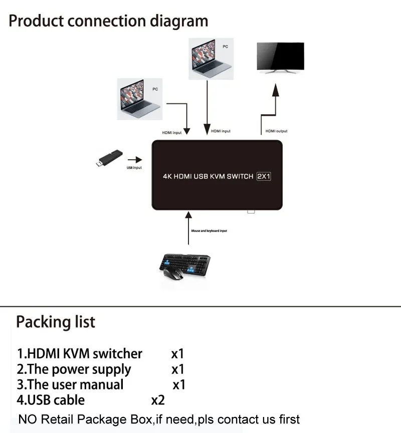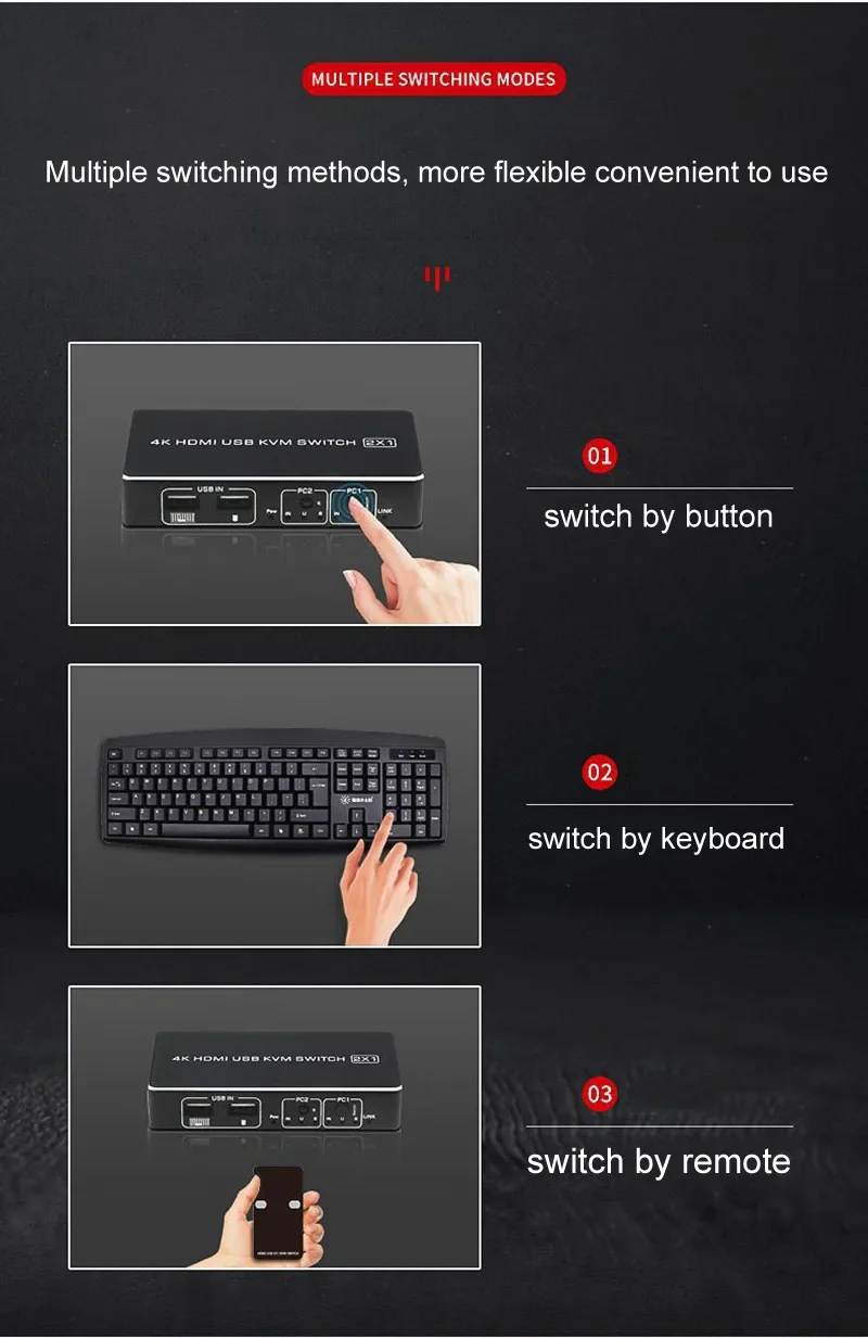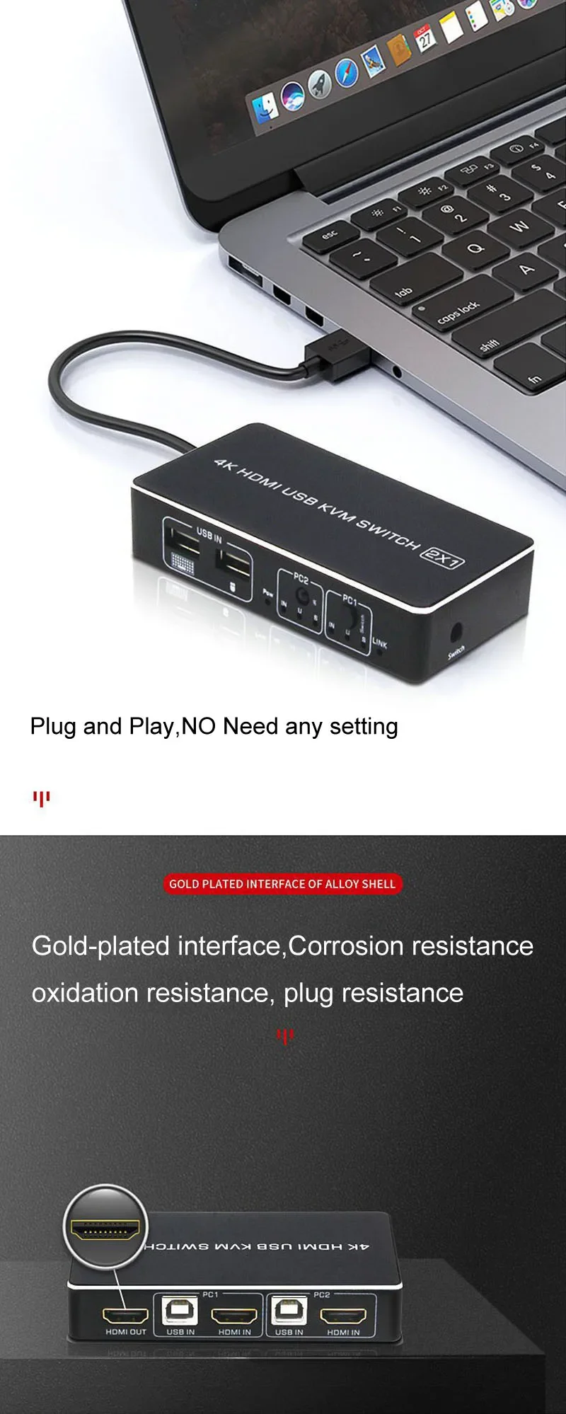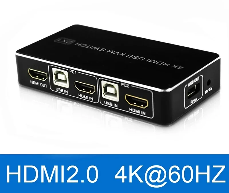 Conmutador de 2 puertos USB HDMI KVM, 4K, 60Hz, 1080p, HDMI2.0, 2x1, compatible con impresora de teclado y ratón, convertidor de vídeo de ordenador portátil a Monitor