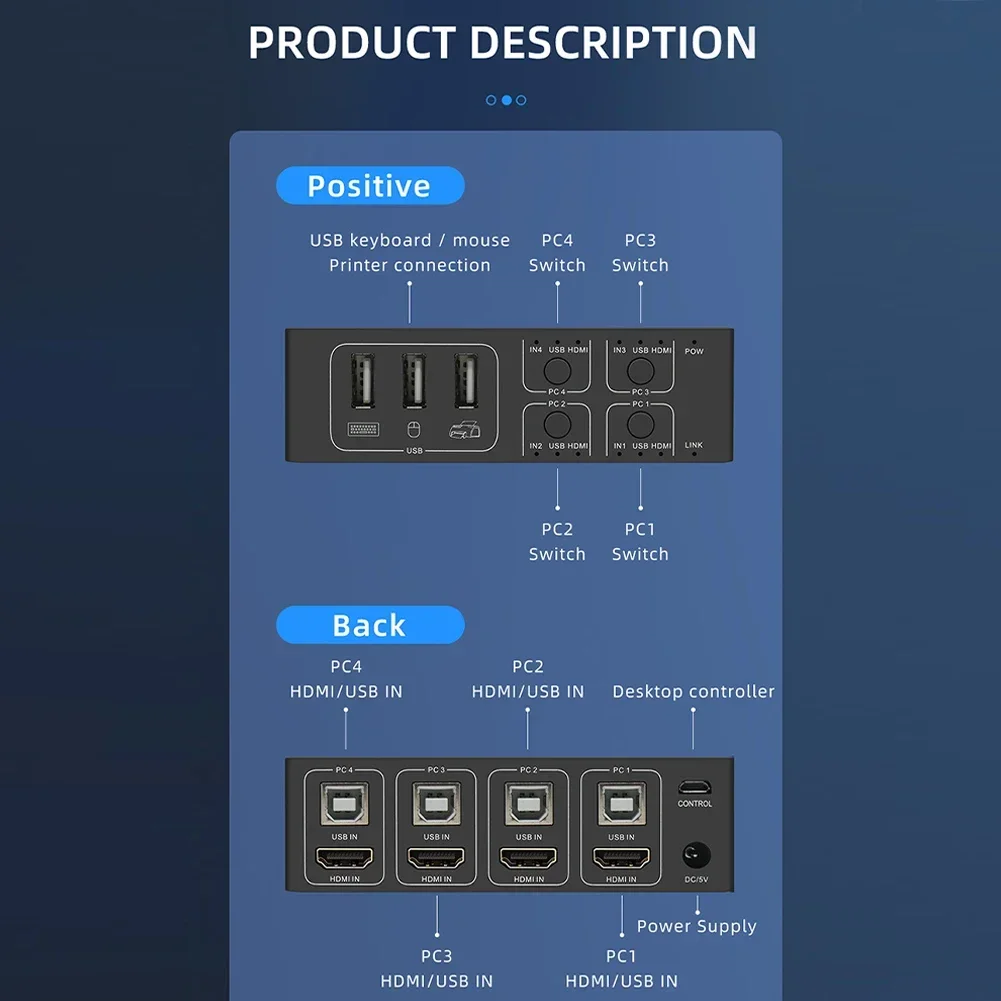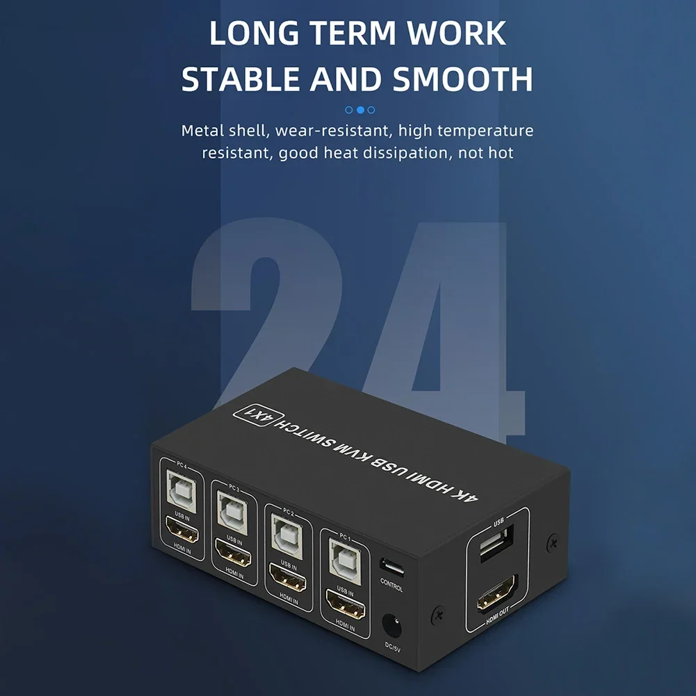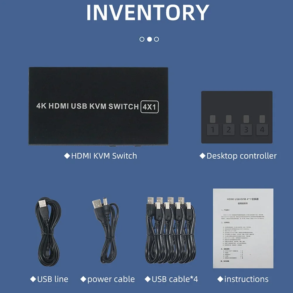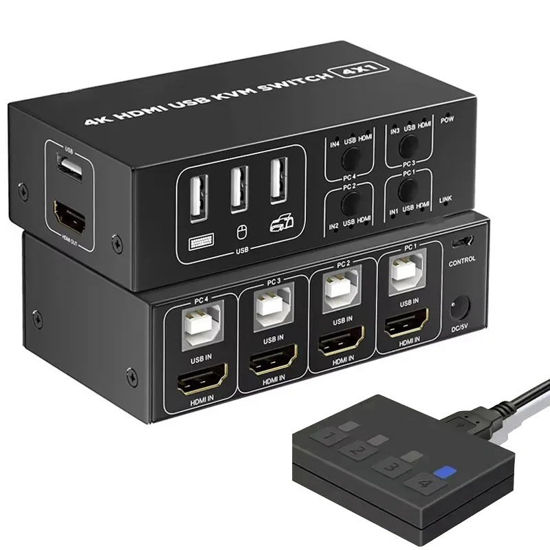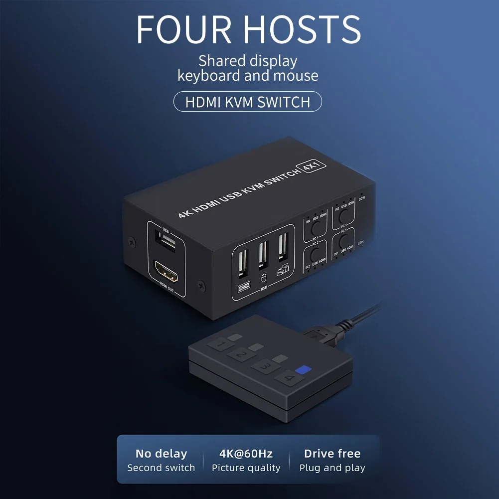 Comprar Conmutador 4K 60Hz 4X1, convertidor de vídeo con interruptor KVM HDMI USB de 4 puertos con controlador de escritorio para 4 PC, Monitor compartido, ratón y teclado