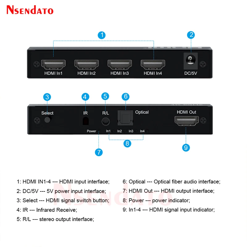 4 interruptor de entrada de señal HDMI a 1 dispositivo de visualización HDMI;