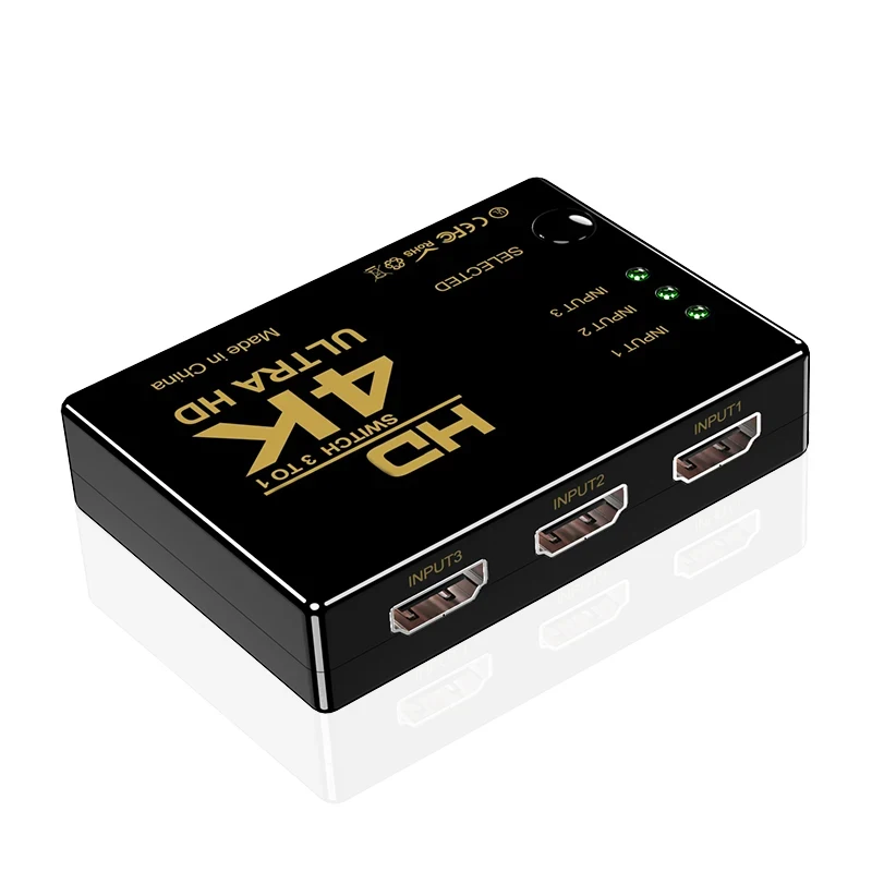 Cambie sin problemas entre cuatro dispositivos con este conmutador 4K x 2K de alta velocidad 3 x 1 HD con control remoto inalámbrico IR.