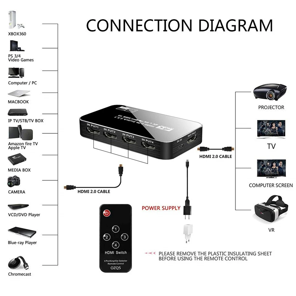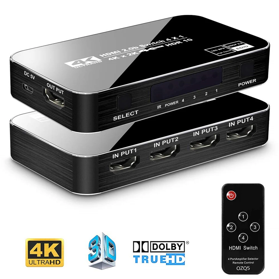 2023 mejor 4K HDMI Switch 2,0 compatible con RGB 4:4:4 HDR HDMI Switch 4K 60Hz HDMI 2,0 Switch remoto IR UHD 4 puertos HDMI Switch Switcher