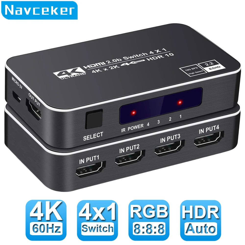 2023 mejor 4K HDMI Switch 2,0 compatible con RGB 4:4:4 HDR HDMI Switch 4K 60Hz HDMI 2,0 Switch remoto IR UHD 4 puertos HDMI Switch Switcher