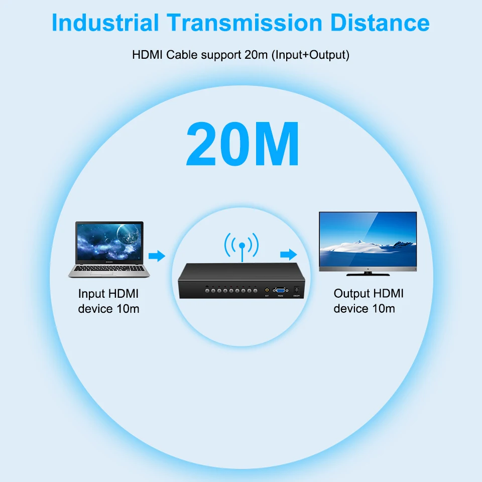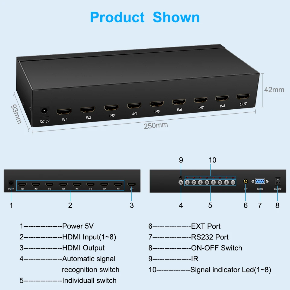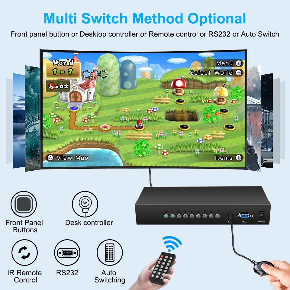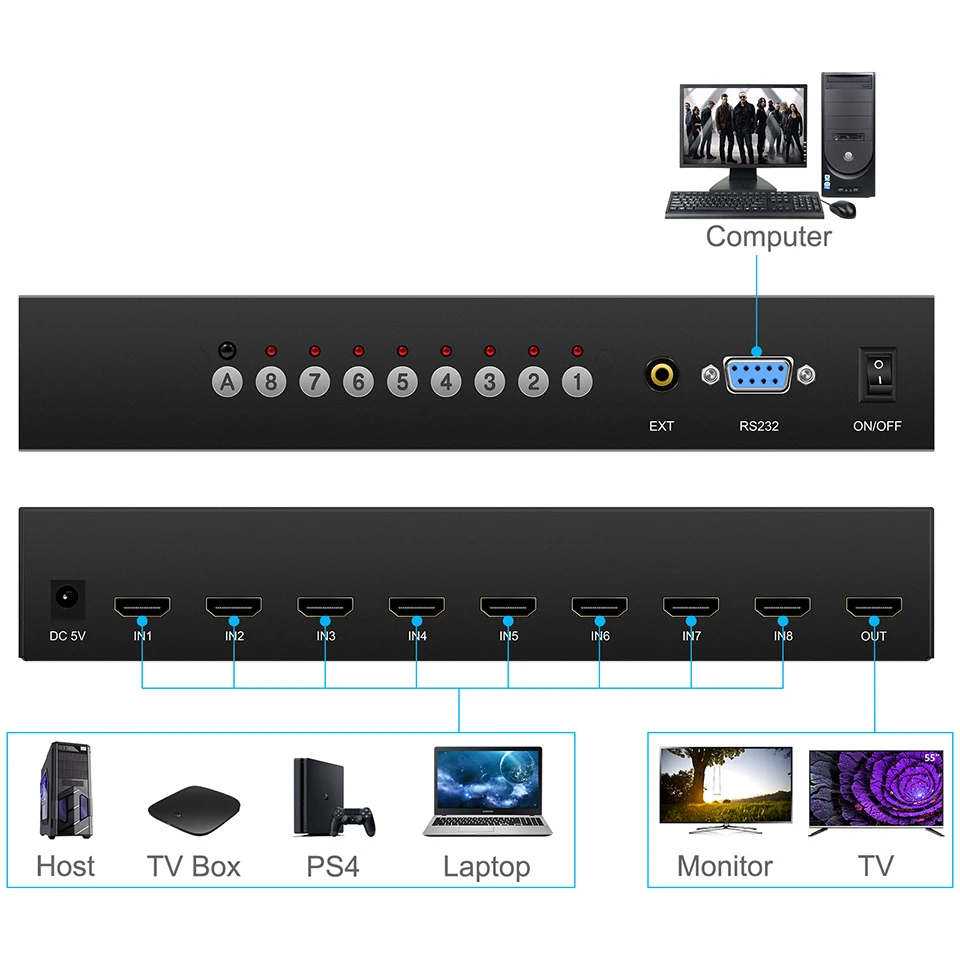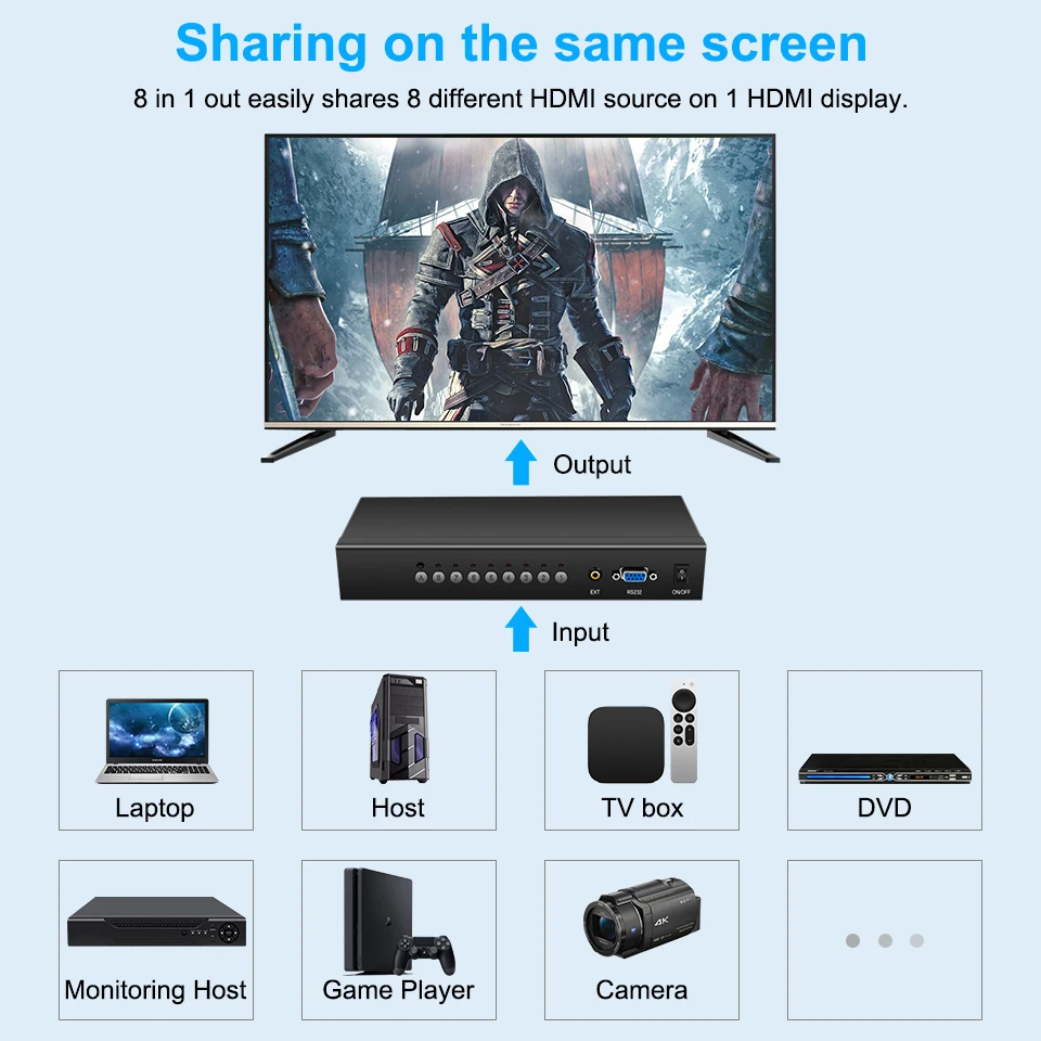 El conmutador HDMI tiene 8 puertos para satisfacer las necesidades de múltiples dispositivos que utiliza al mismo tiempo. El fácil cambio de un toque le permite enamorarse de este interruptor HDMI y ya no realizar operaciones complejas en la TV.
