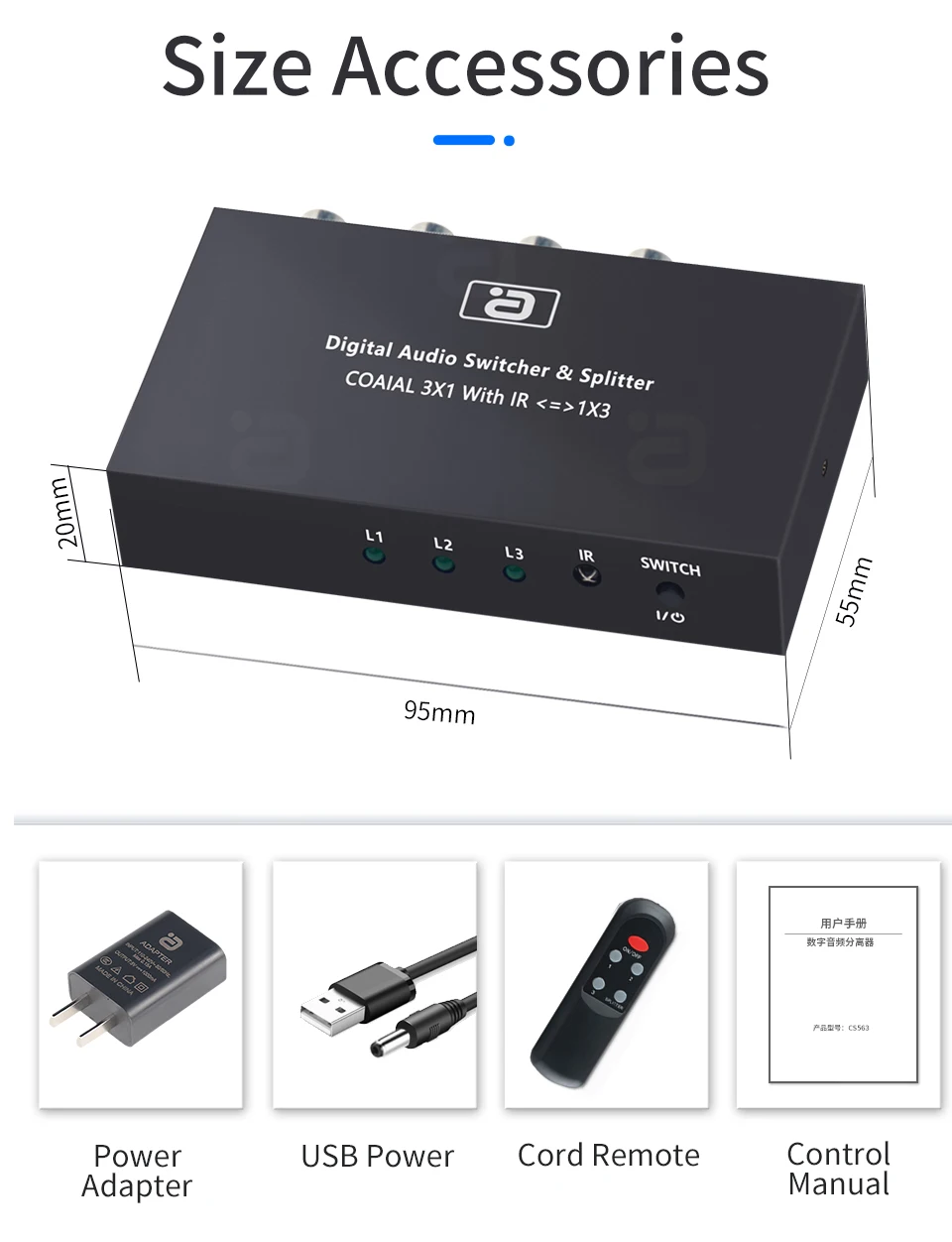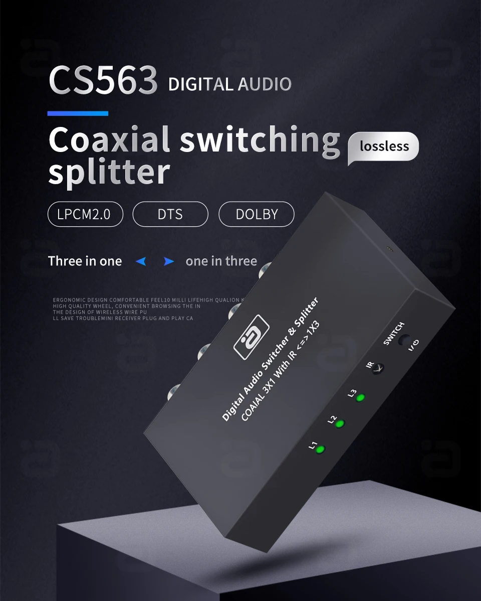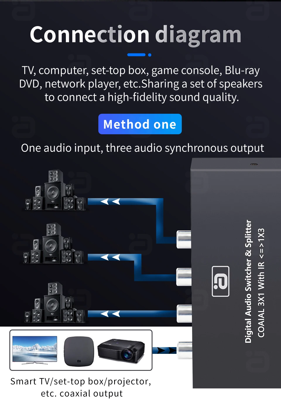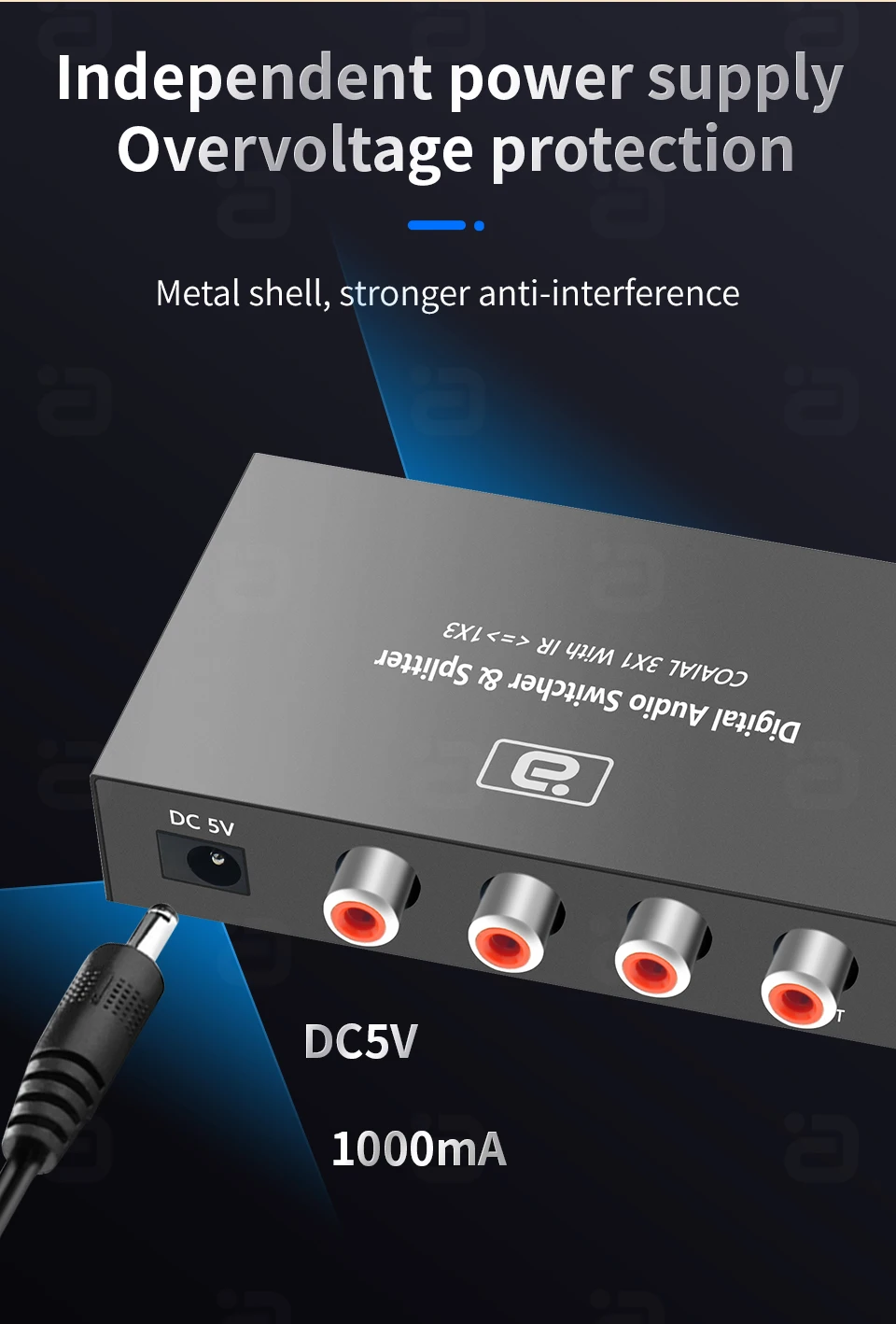 El conmutador de audio digital COAXIAL permite a los usuarios conectar tres fuentes de señal COAXIAL digital a una salida COAXIAL en el amplificador AV. Cuando los tres indicadores de señal LED están todos encendidos, el estado de la función de la distribución de la señal de entrada. Este distribuidor de audio digital COAXIAL permite a los usuarios conectar y distribuir una fuente COAXIAL digital a tres amplificadores de potencia.