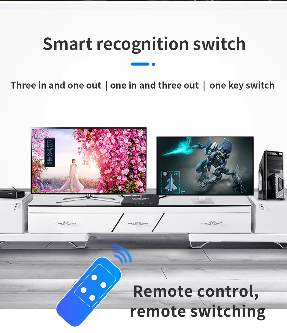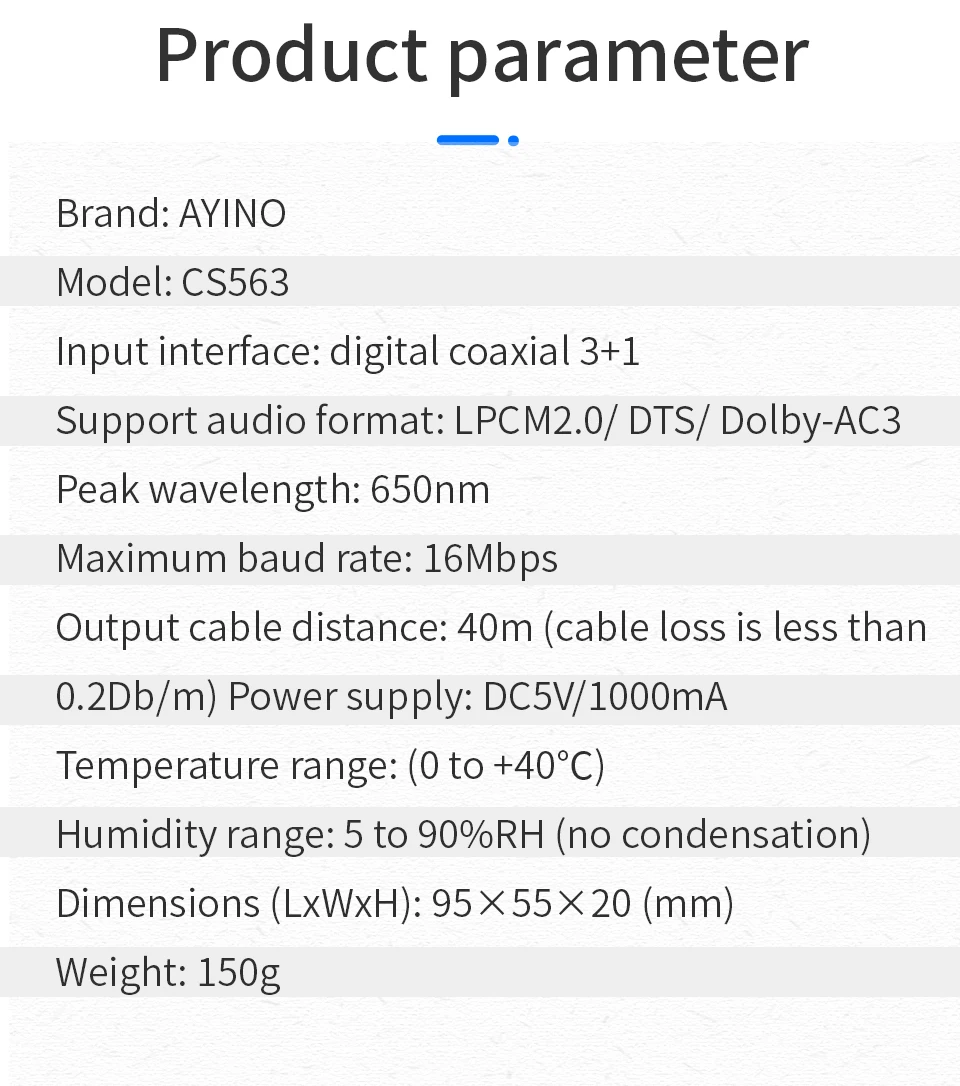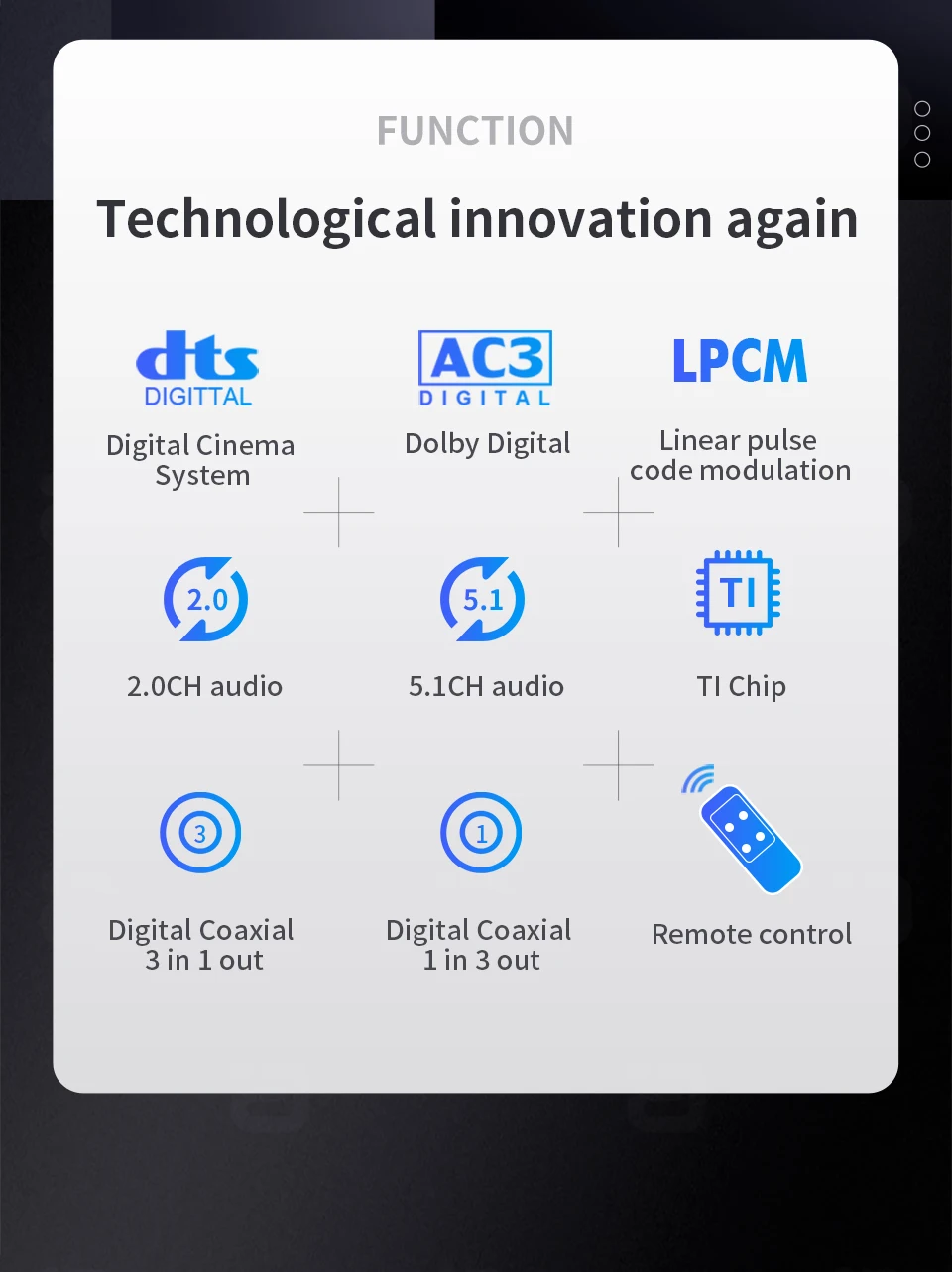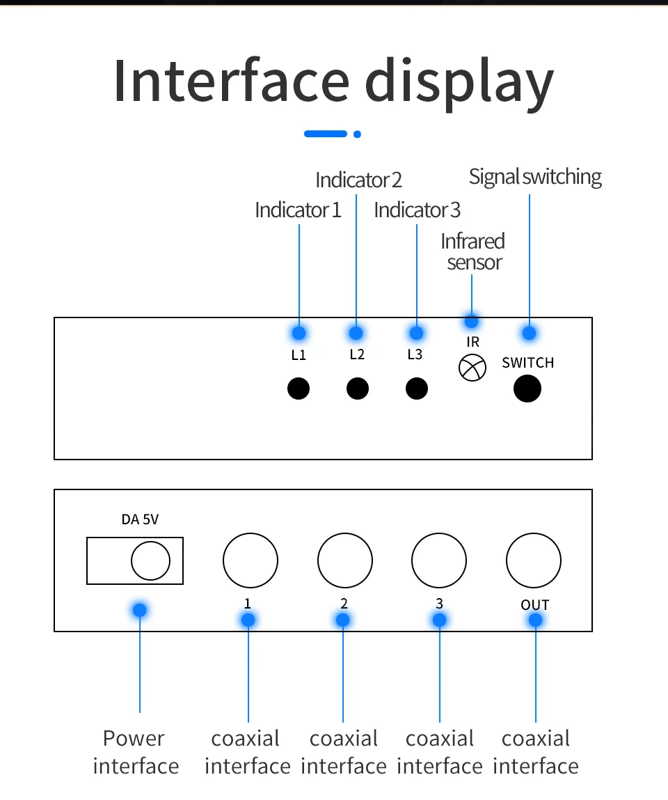 El conmutador de audio digital COAXIAL permite a los usuarios conectar tres fuentes de señal COAXIAL digital a una salida COAXIAL en el amplificador AV. Cuando los tres indicadores de señal LED están todos encendidos, el estado de la función de la distribución de la señal de entrada. Este distribuidor de audio digital COAXIAL permite a los usuarios conectar y distribuir una fuente COAXIAL digital a tres amplificadores de potencia.