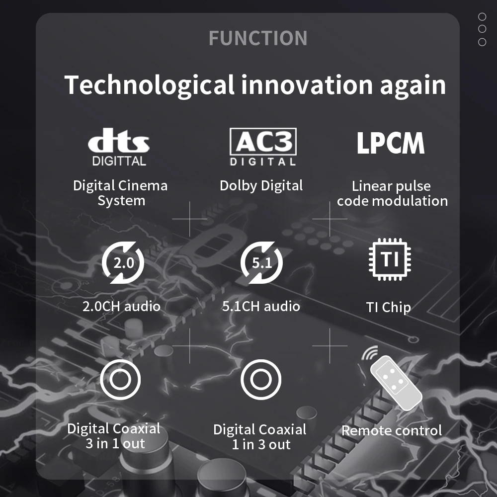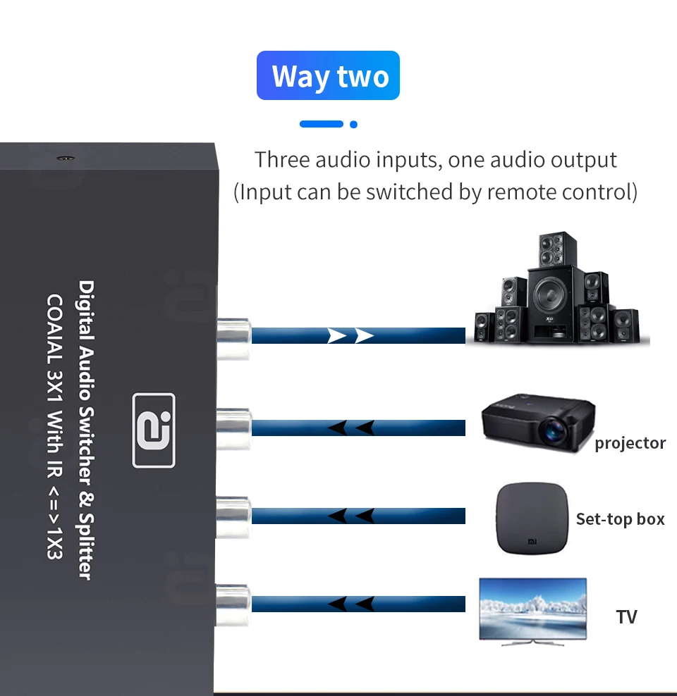Comprar Conmutador de Audio Coaxial Digital Dolby 5,1 DTS AC3, convertidor bidireccional 3 a 1, extensor divisor de Audio con Control remoto IR