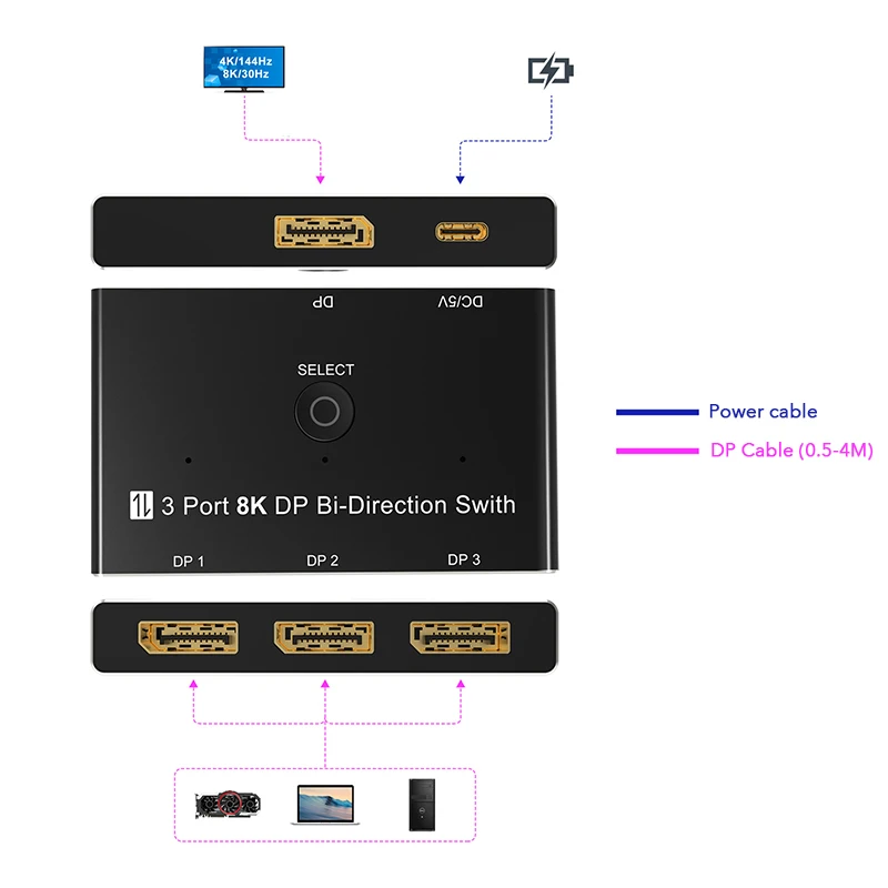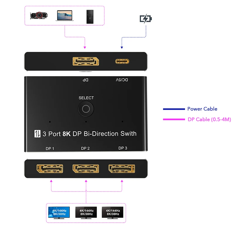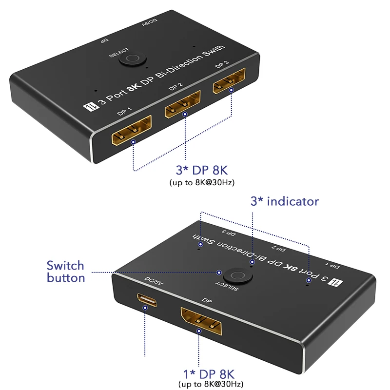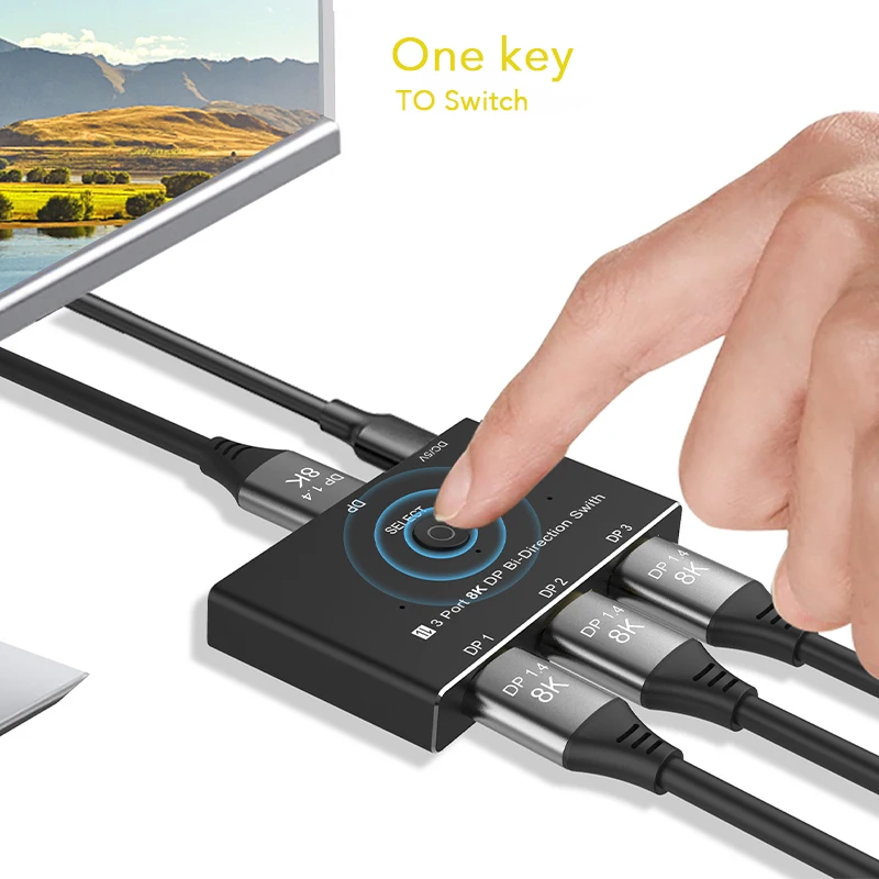 8K@60Hz DisplayPort 1x3/3x1 Conmutador bidireccional 3 puertos Divisor DP 1.4 Convertidor 4K@144Hz para interruptor Pantalla de múltiples fuentes