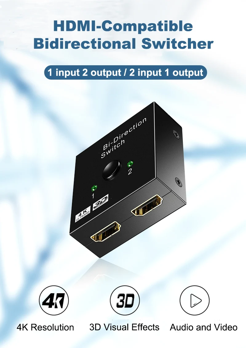 This bi-directional HDMI-compatible Switch transmits the audio and video simultaneously,you can build your theater at home freely.