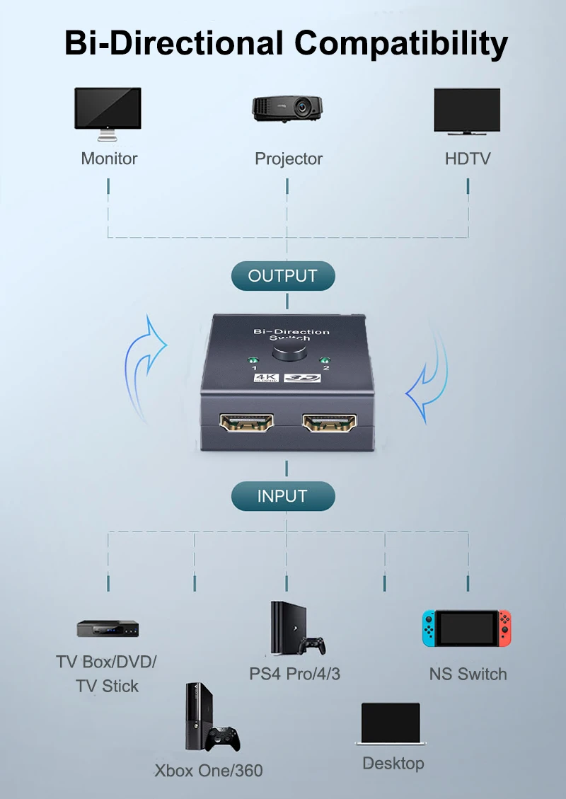 HDMI-compatible switcher 2 ports allows you connect most devices with standard HDMI-compatible interface, such as Nintendo Switch, Xbox 360/One, Full HD TVs, for PS3 PS4, Monitor, Projectors and so on.
