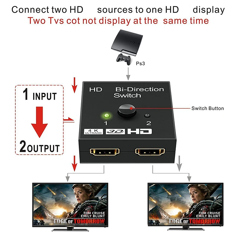 Comprar Conmutador compatible con HDMI 4K, 2 puertos bidireccionales, 1x2/2x1, HD, divisor, 4K, 1080P, 3D, HDR, HDCP, para PS4, PS3, Xbox, HDTV BOX
