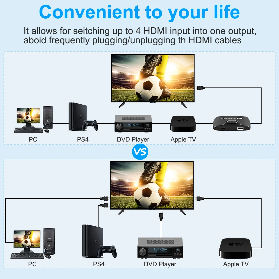 * Alta resolución UHD y amplia compatibilidad: conmutador compatible con HDMI 4 en 1 compatible con 4K@30Hz, compatible con PS3/PS4/PS5, Xbox 360/One, HDTV, reproductor Blu-Ray.La pantalla más clara y delicada le brinda un festín visual y una excelente experiencia de juego.