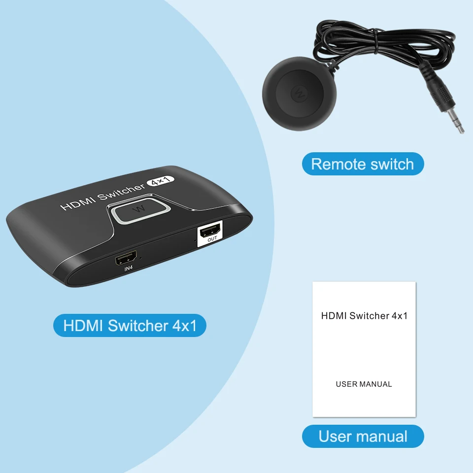 *Interruptor compatible con HDMI con control remoto: saltará automáticamente al siguiente puerto con una entrada de señal viable; Saltará automáticamente a la fuente de señal compatible con HDMI insertada más recientemente.La conmutación manual se puede realizar mediante control remoto IR inalámbrico.(Consejos: No permitirá cambiar automáticamente a Apple TV debido al principio de protección actual)