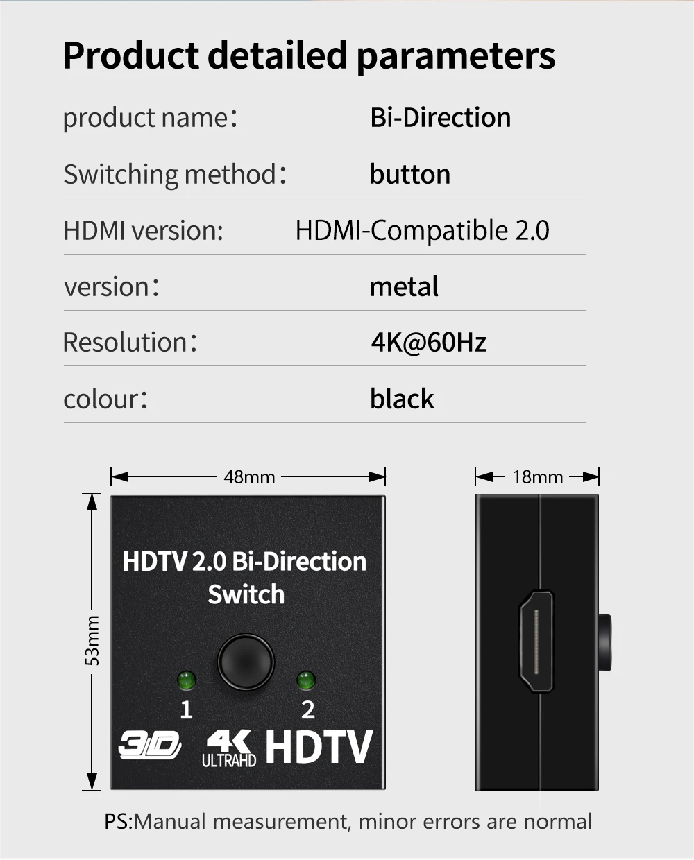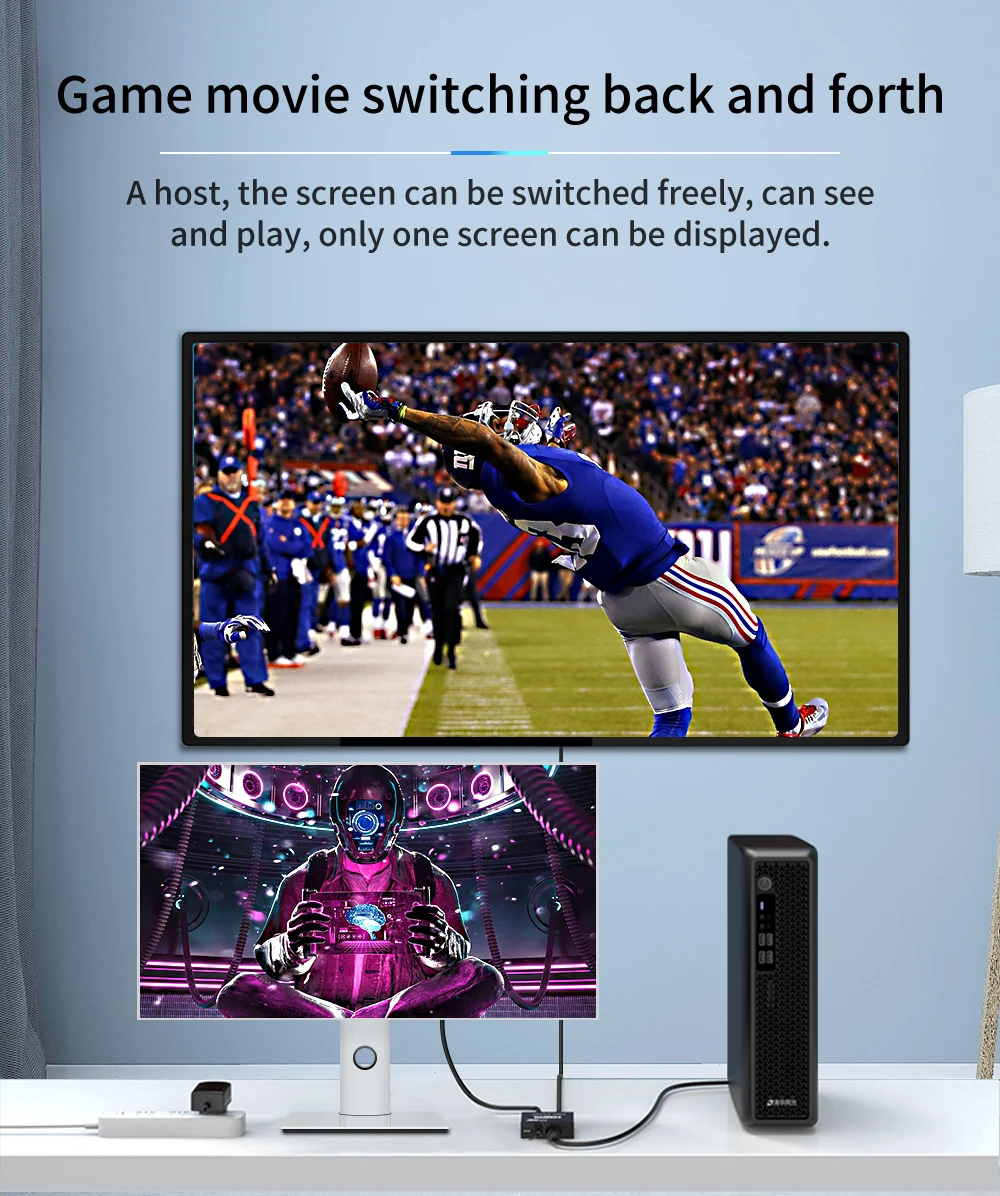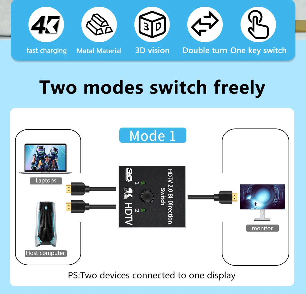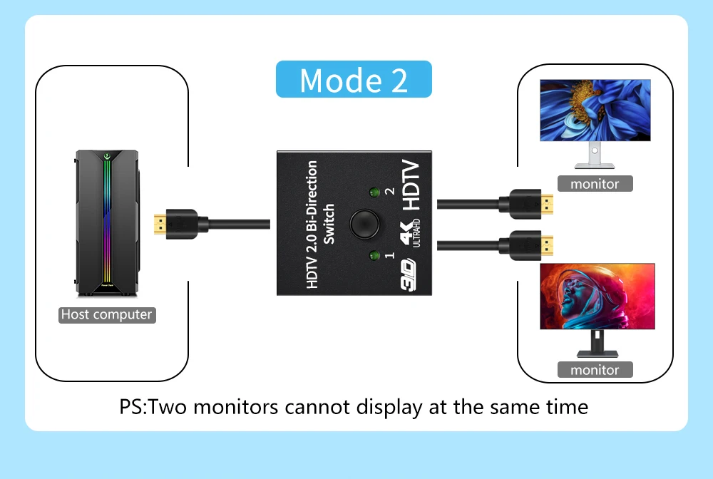 INTERRUPTOR BIDIRECCIONAL Compatible con HDMI: Este divisor Compatible con HDMI 1 en 2 salidas/2 en 1 salida puede conectar dos fuentes compatibles con HDMI a una pantalla Compatible con HDMI o conectar una fuente Compatible con HDMI para alternar entre dos pantallas(solo se mostrará un monitor).