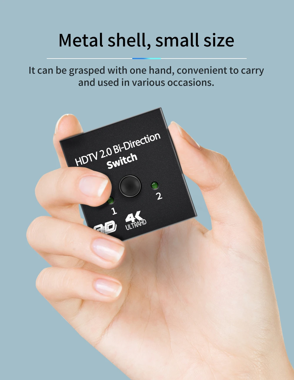 PLUG AND PLAY:No se necesitan controladores ni alimentación externos, el interruptor Compatible con HDMI funcionará una vez conectado.Simplemente presione el botón para cambiar la fuente de entrada o salida y el indicador LED le indica qué puerto está activo.