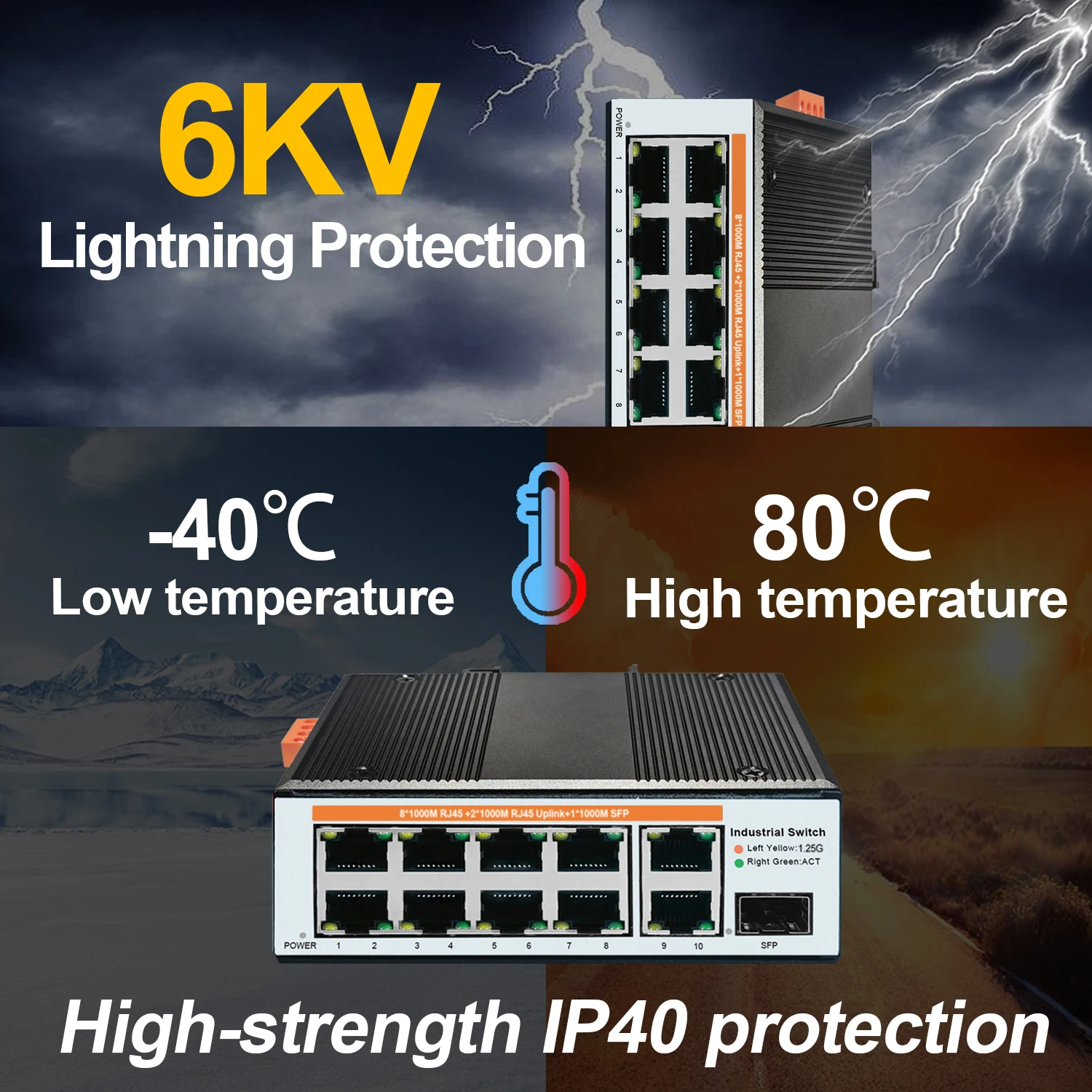Comprar Conmutador Ethernet Industrial Gigabit de 10 puertos, interruptores de red exterior no gestionados de 1000Mbps, IP40 -40 a 80 °C, carril DIN de Metal