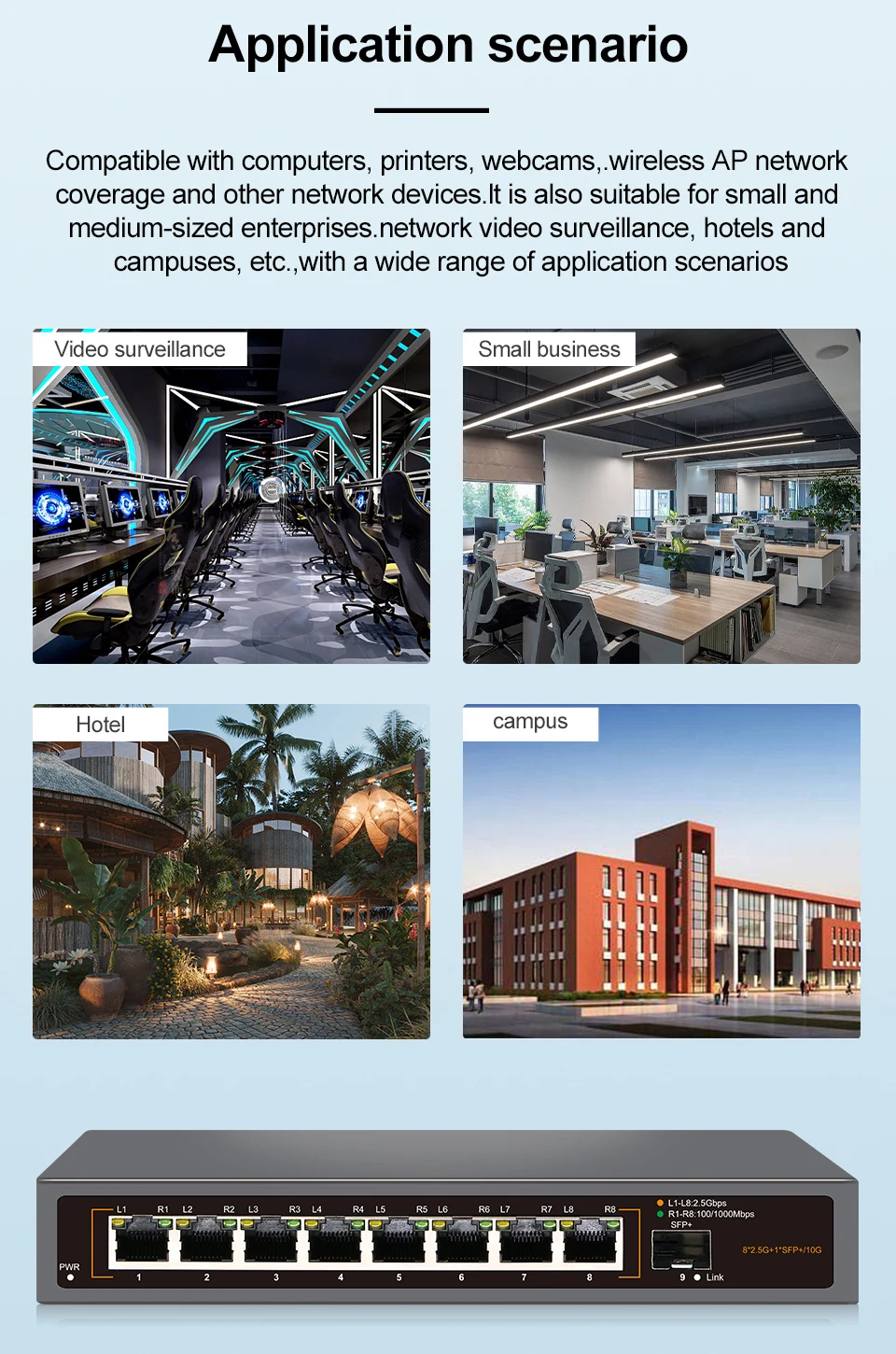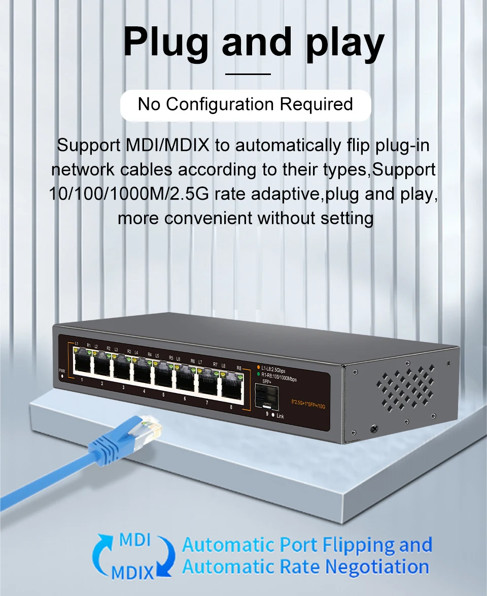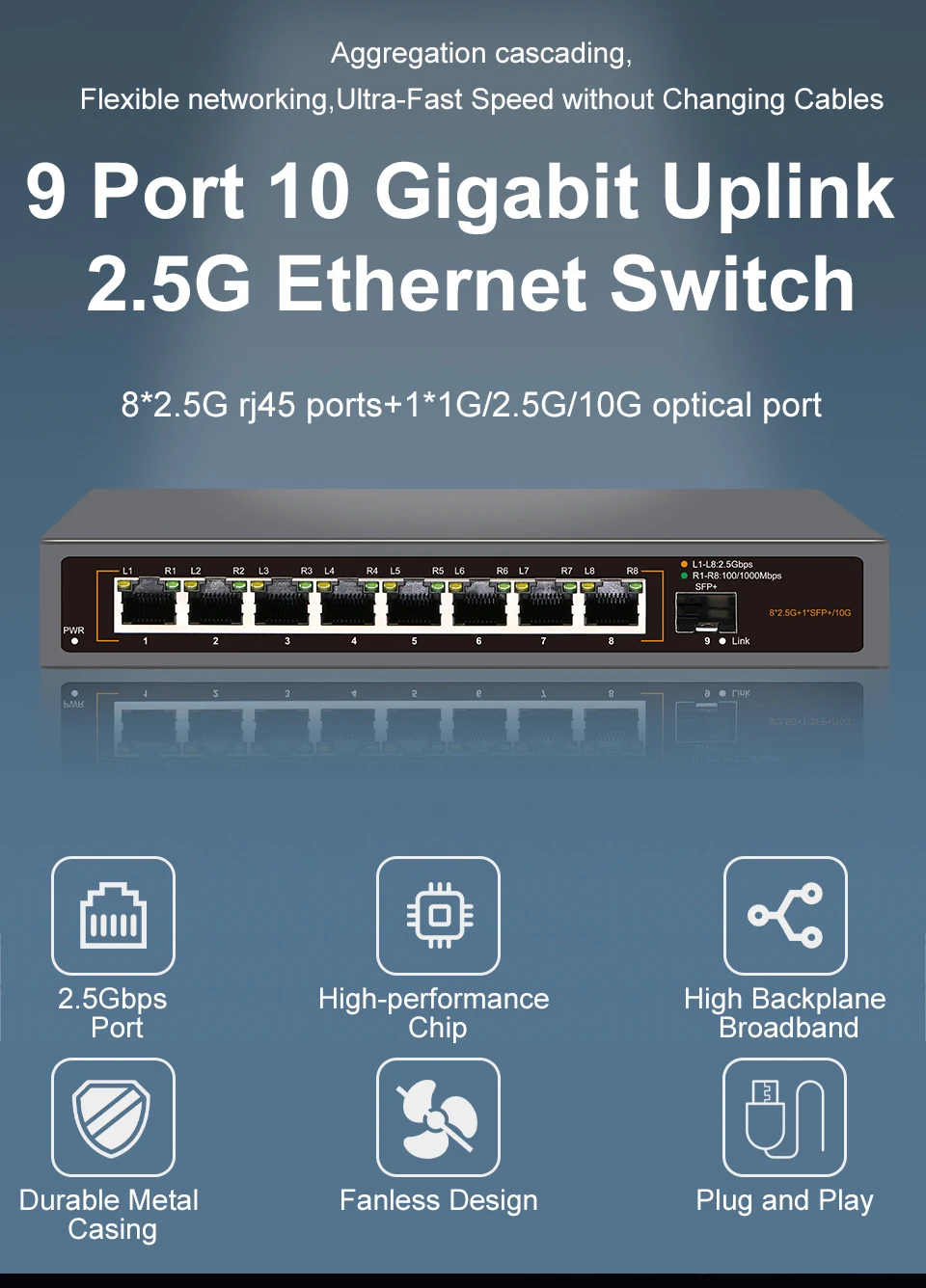 Producto muy bueno, de excelente calidad, que ha duplicado o incluso triplicado mi velocidad de transferencia. Hice un pedido. 8+1 (8 puertos de 2.5 Gigabit + 1 puerto de 10 Gigabit) Recibí 8+2 (8 puertos de 2.5 Gigabit + 2 puertos de 10 Gigabit) Gracias al vendedor por esto.