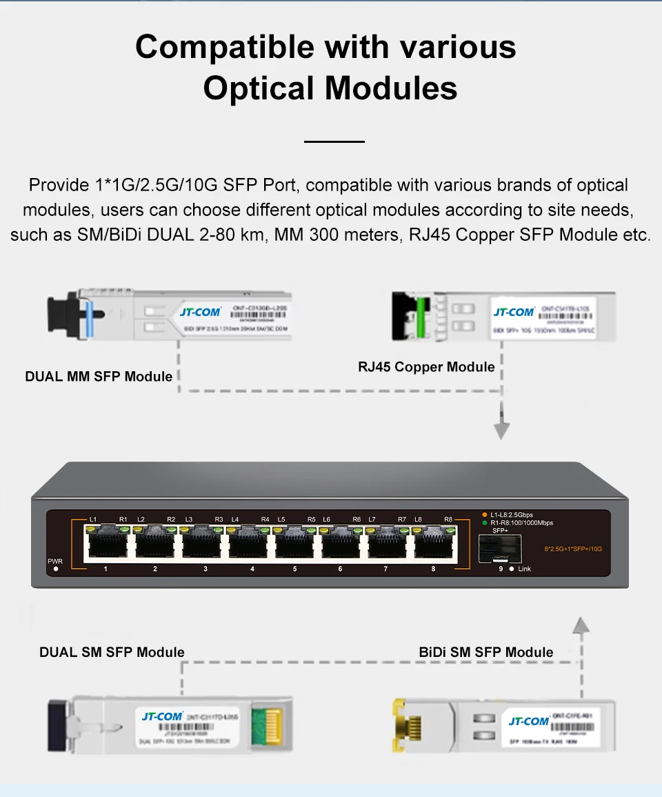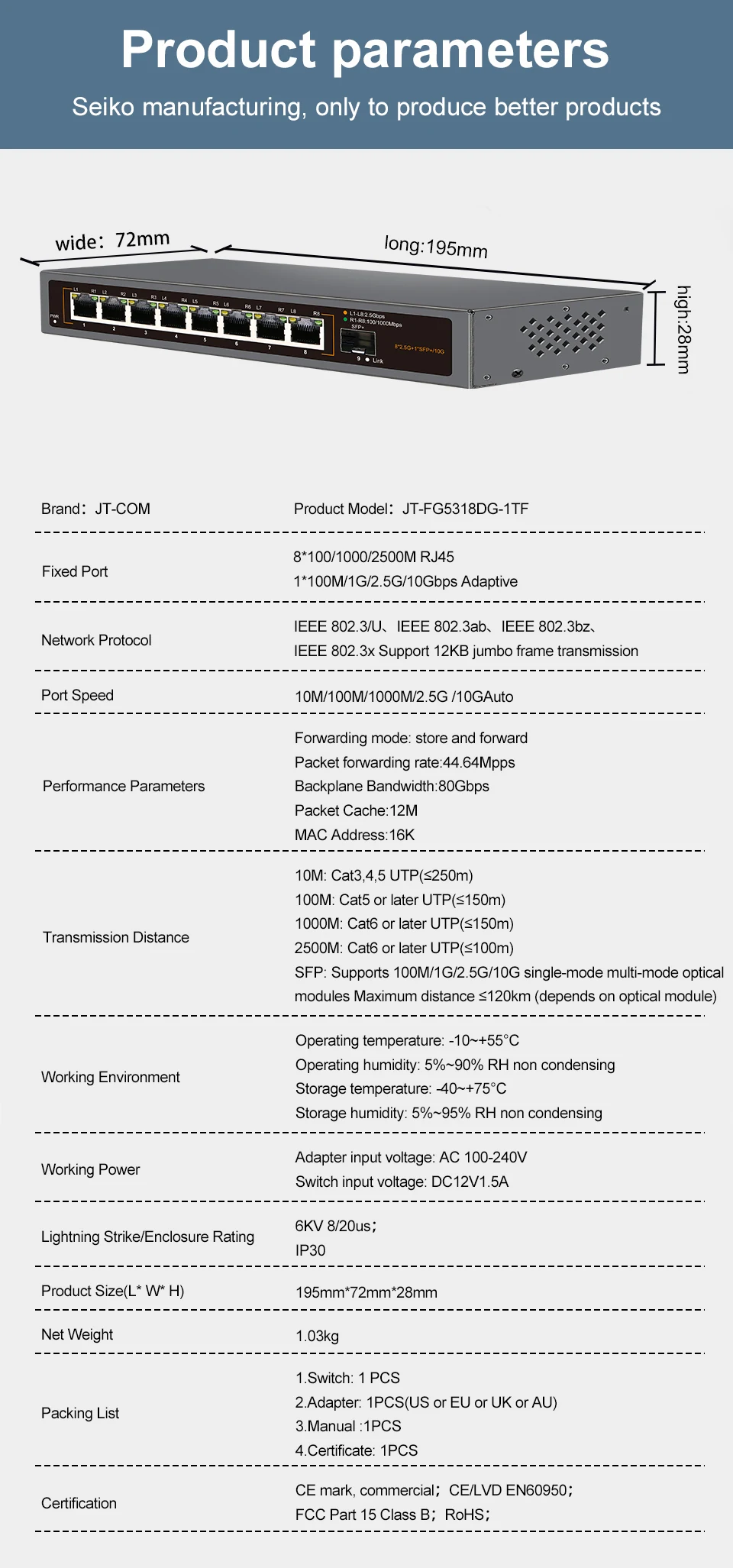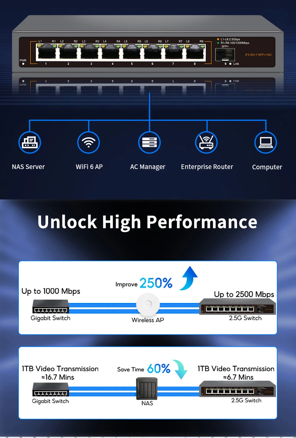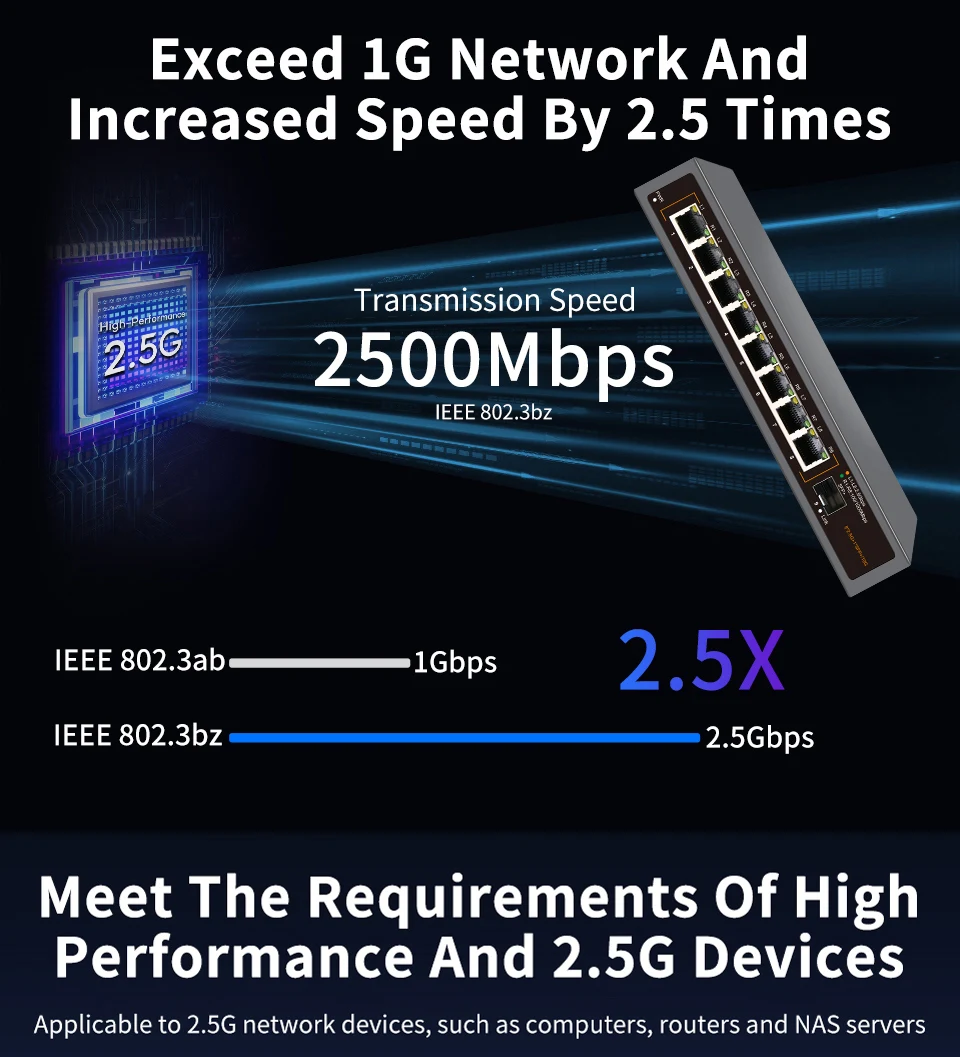 Producto muy bueno, de excelente calidad, que ha duplicado o incluso triplicado mi velocidad de transferencia. Hice un pedido. 8+1 (8 puertos de 2.5 Gigabit + 1 puerto de 10 Gigabit) Recibí 8+2 (8 puertos de 2.5 Gigabit + 2 puertos de 10 Gigabit) Gracias al vendedor por esto.