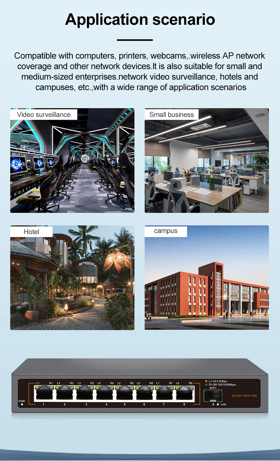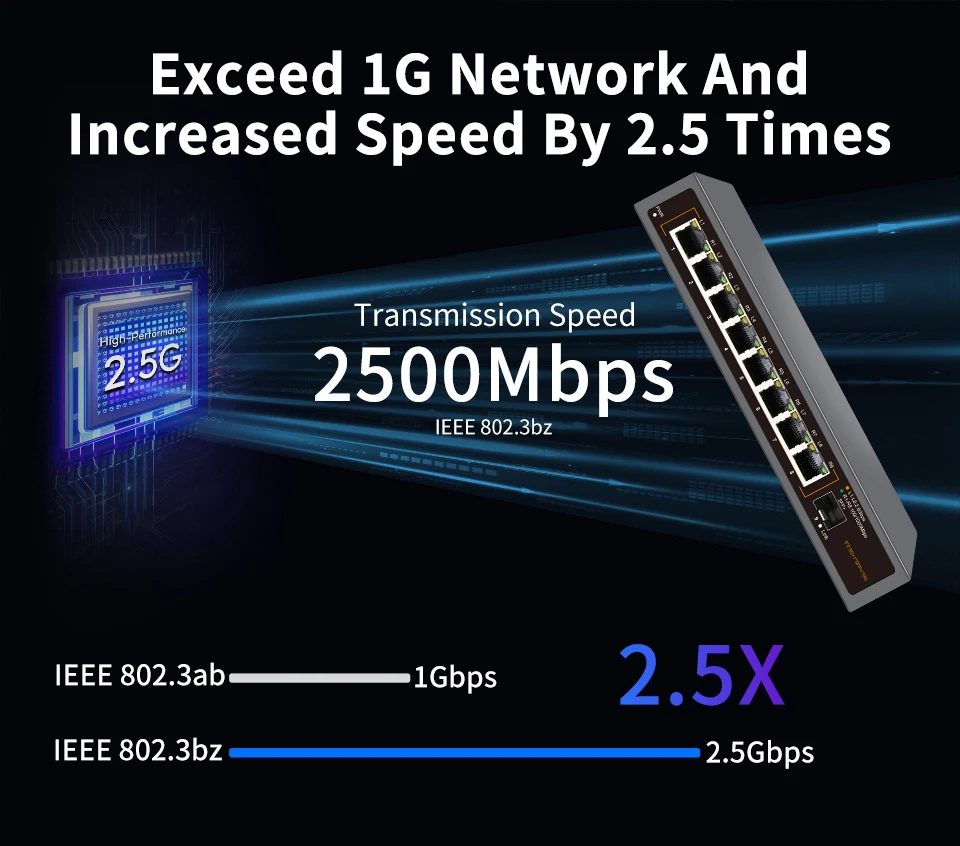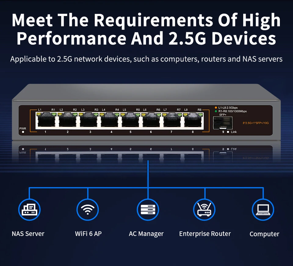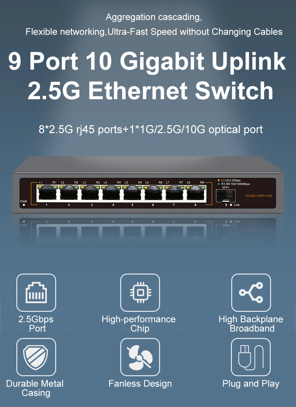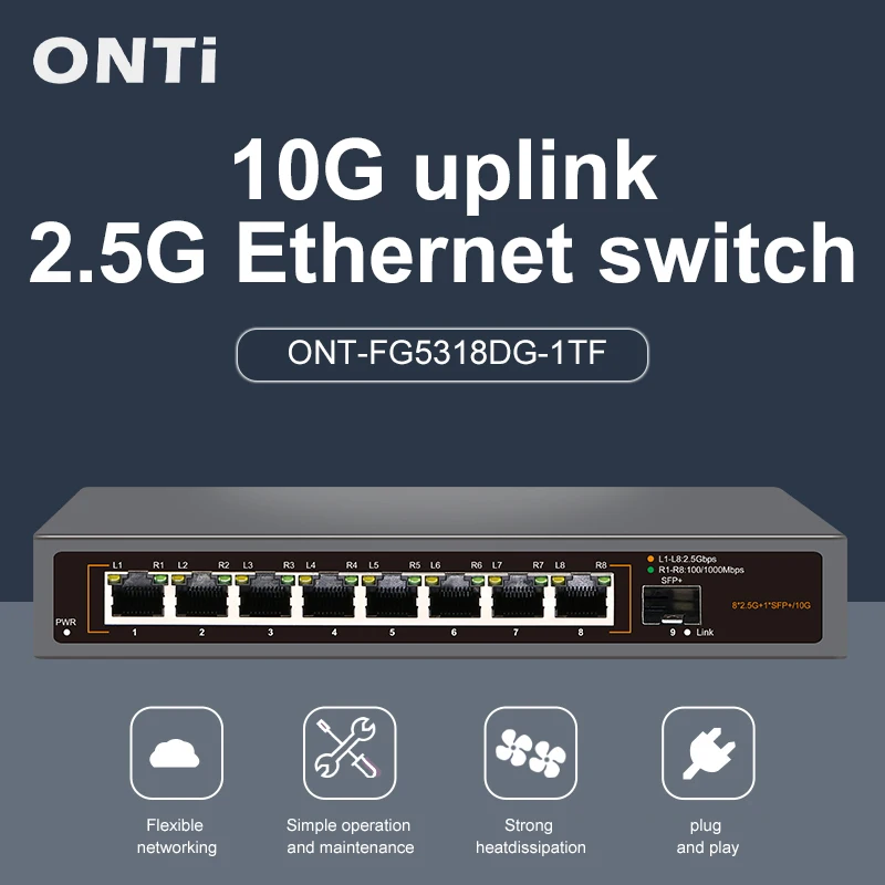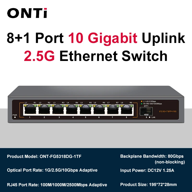 Conmutador Ethernet no administrado ONTi de 2,5 GbE, conmutador de red de 8 puertos 2,5 GBASE-T con puerto SFP + de 10G, conmutador Homelab sin ventilador Plug and Play