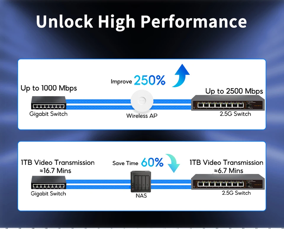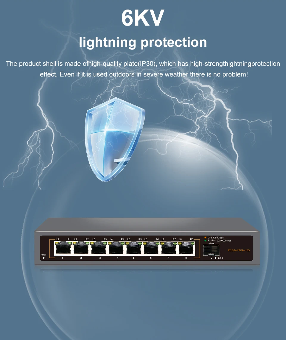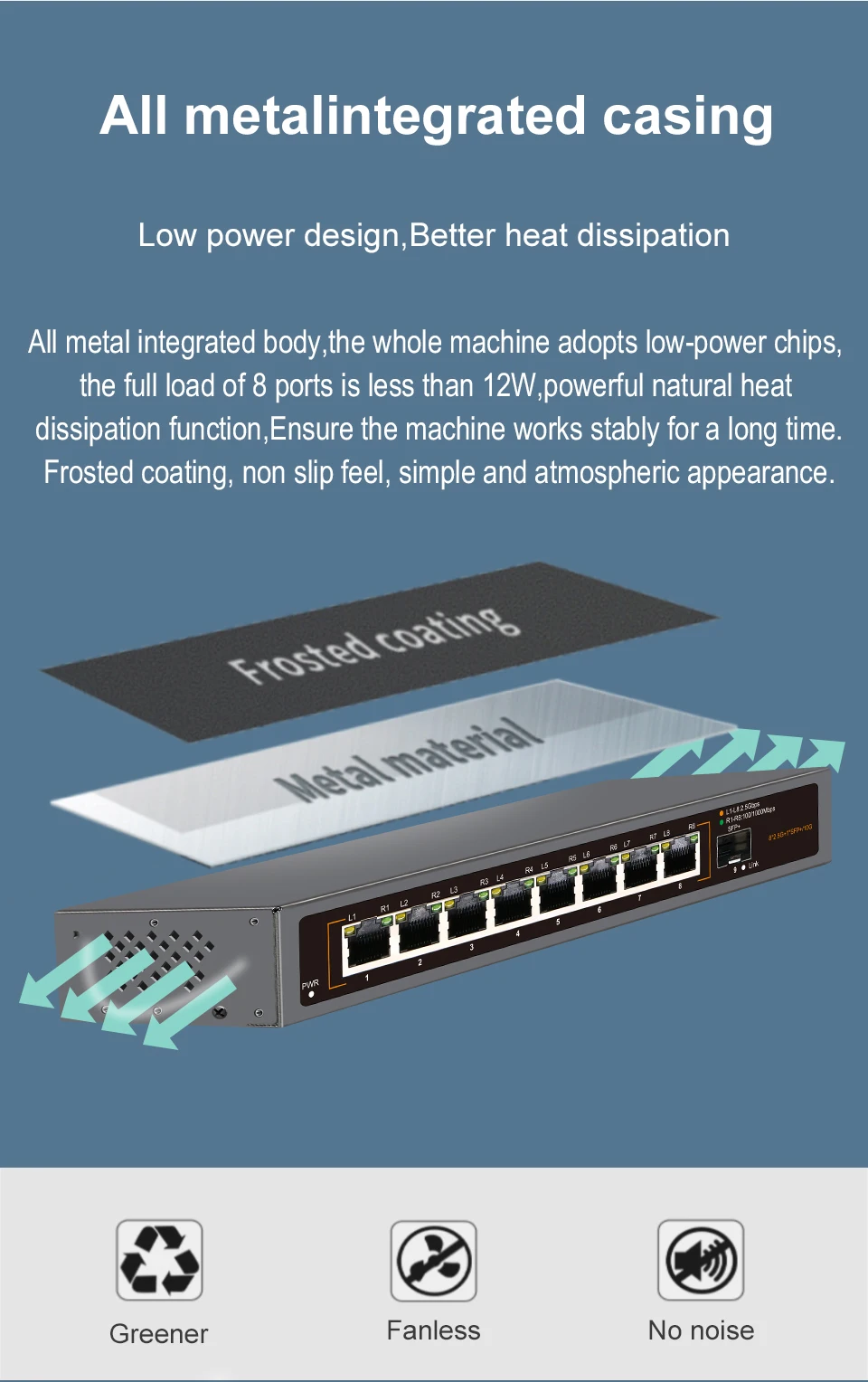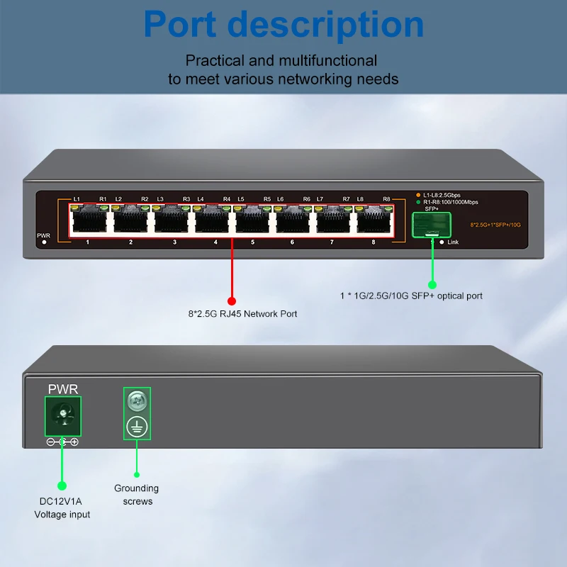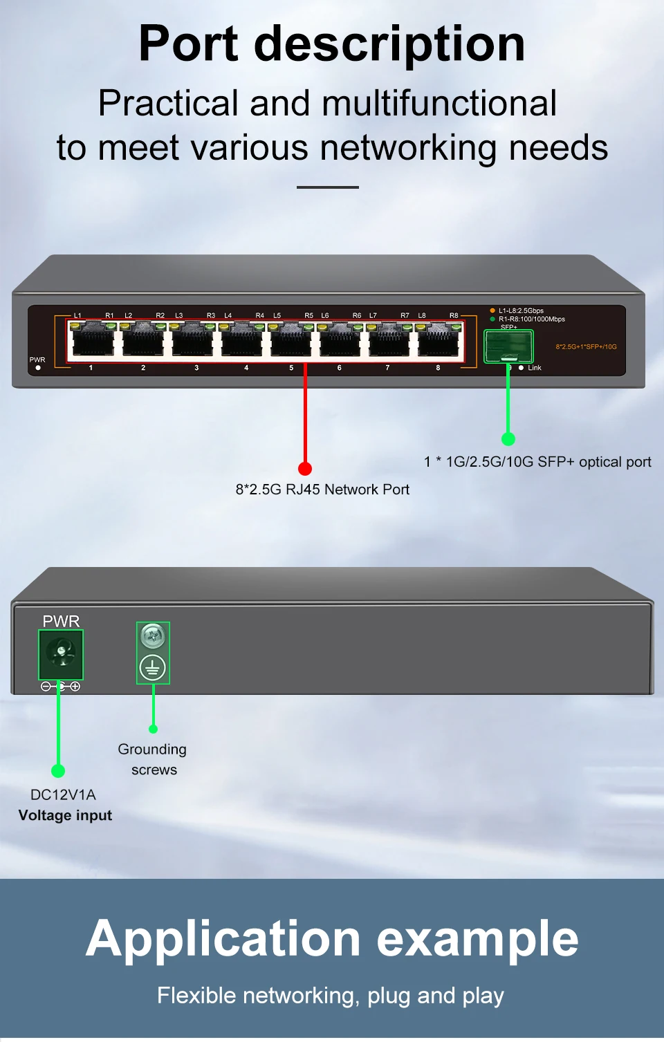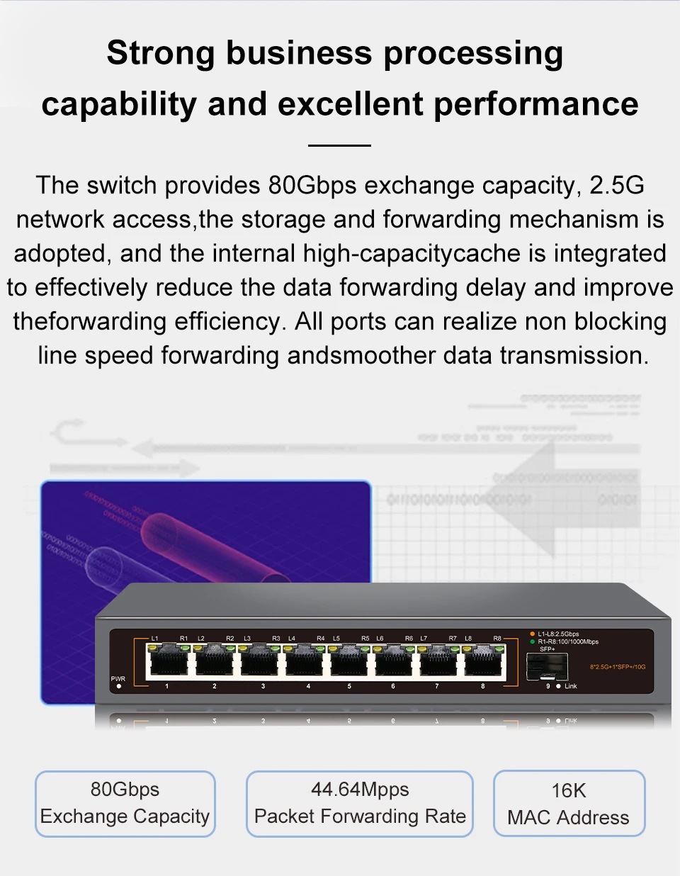 Conmutador Ethernet no administrado ONTi de 2,5 GbE, conmutador de red de 8 puertos 2,5 GBASE-T con puerto SFP + de 10G, conmutador Homelab sin ventilador Plug and Play