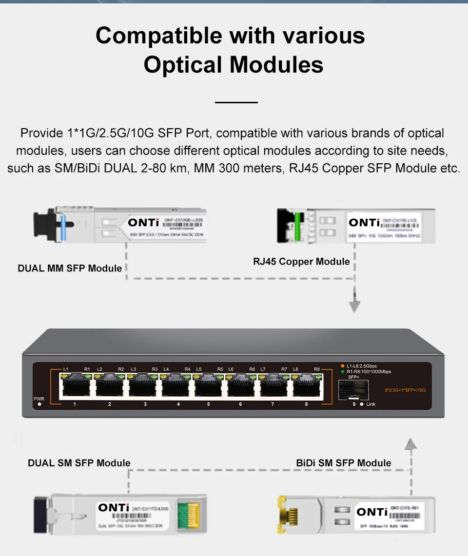 Comprar Conmutador Ethernet no administrado ONTi de 2,5 GbE, conmutador de red de 8 puertos 2,5 GBASE-T con puerto SFP + de 10G, conmutador Homelab sin ventilador Plug and Play