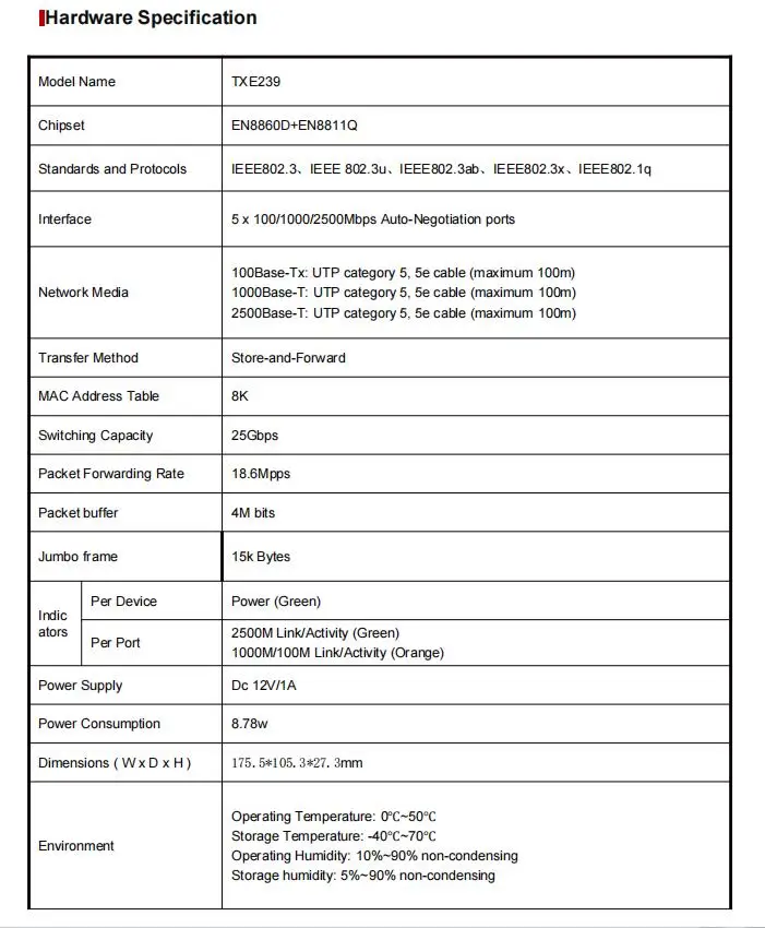 TXE239 es un conmutador Ethernet no gestionado de 5 puertos 100/1000/2500Mbps que proporciona una conexión de red perfecta.