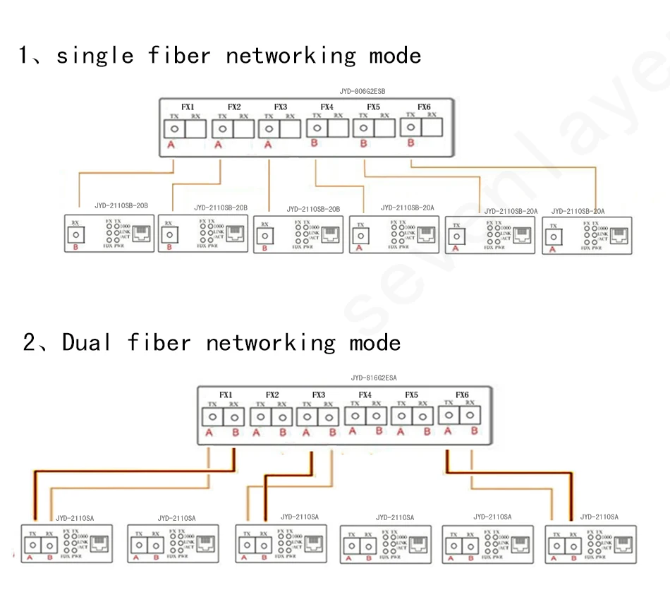 1.Por defecto con módulo de fibra lateral A de 3 piezas de 1310 nm y 3 piezas de lado de 1550 nm B, se pueden proporcionar 6 piezas de lado B de 1550 nm o 6 piezas de lado A de 1310 nm a pedido.