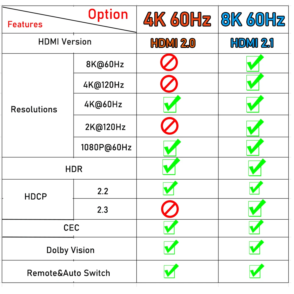 3)4K&8K video transmission has very high requirements on cables and devices. When using with 4K@60Hz video sources and displays, HDMI ATC certified premium high speed HDMI and above cables needed.