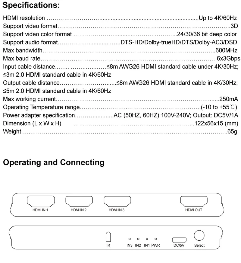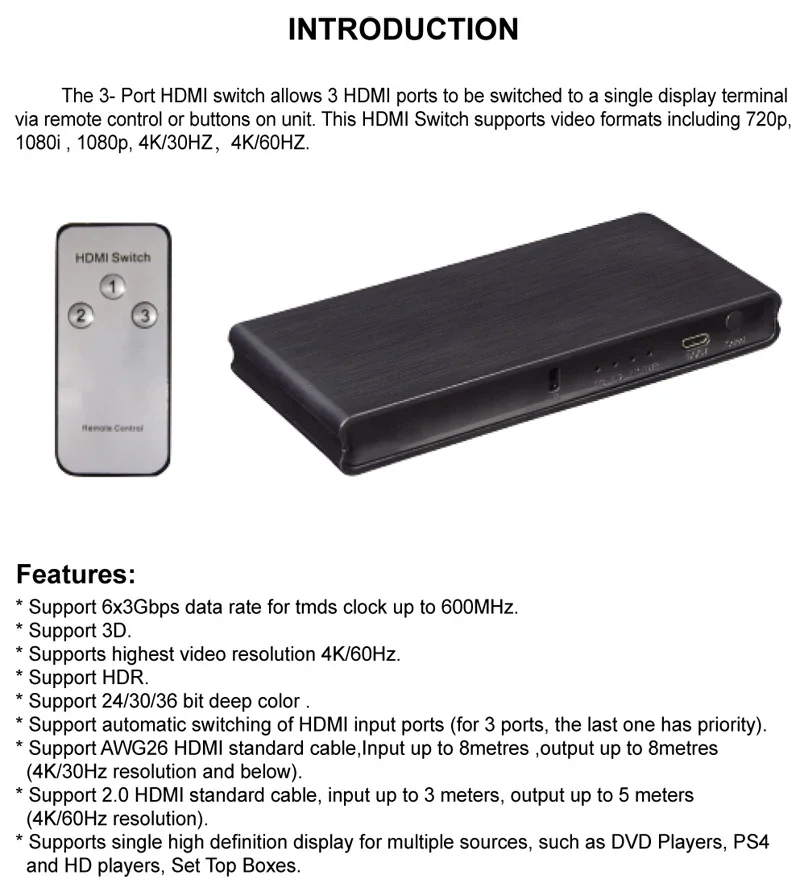 Comprar Conmutador HDMI 2,0 3x1 4x1 5x1, conmutador HDMI 4K 60Hz, convertidor de vídeo HDR 3D para cámara PS4, DVD, portátil, PC a proyector de Monitor de TV