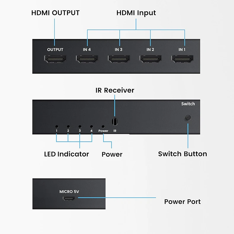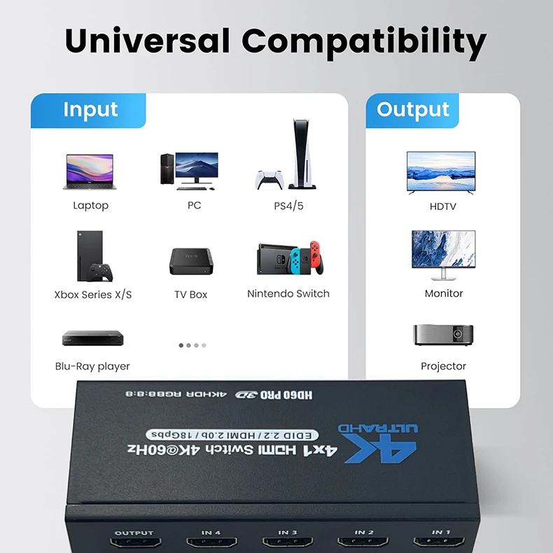 El conmutador HDMI 4K de HDmatters le permite conectar y cambiar entre más de 1 dispositivo fuente HDMI activado y funcionando para mostrarlo en una sola pantalla HDMI.