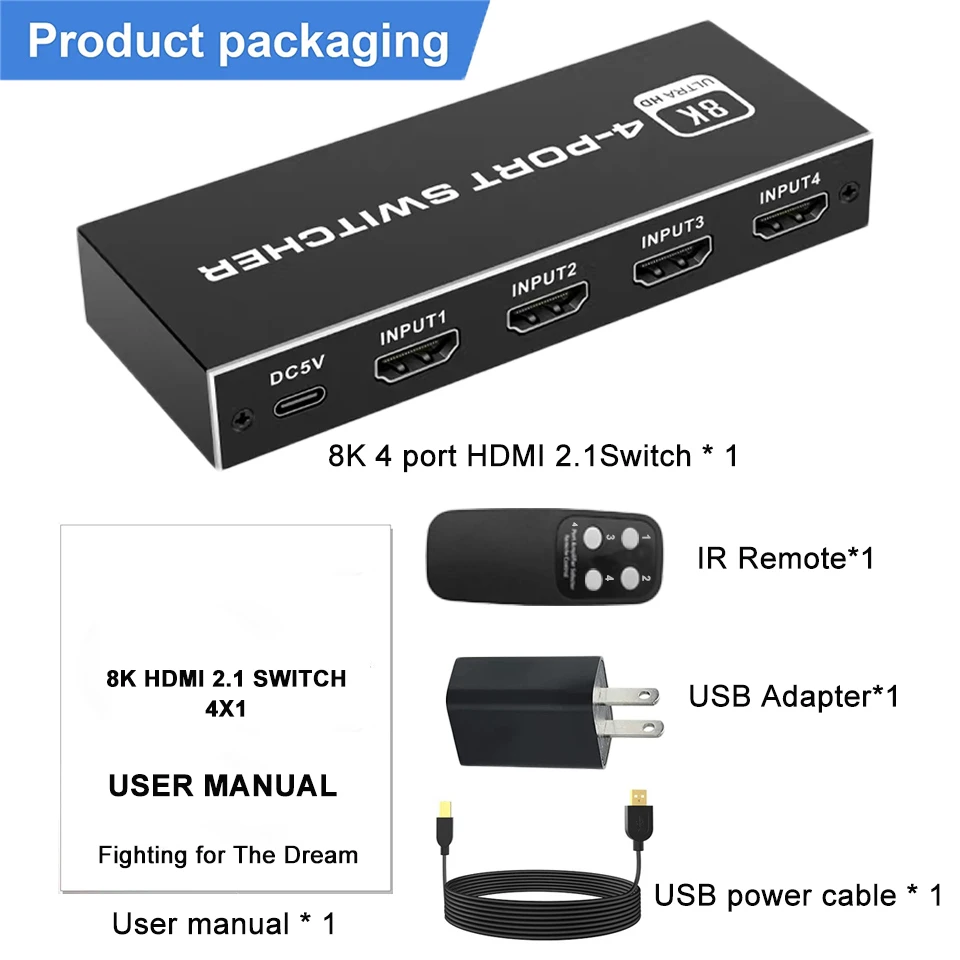 Consejos cálidos: 1)🔥Al conectarse a la fuente o a la pantalla, se recomienda encarecidamente utilizar una fuente de alimentación con un cable Micro USB de un adaptador de corriente USB de 5V para un mejor rendimiento. 2)🔥Para una resolución de 8K, la longitud de los cables HDMI conectados a ambos extremos del interruptor no debe exceder los 3 metros respectivamente. 3)🔥Si necesita salida 8K @ 60Hz y 4K @ 120Hz, le recomendamos que utilice un cable estándar HDMI 2,1 de alta calidad, ¡Comparta el vídeo y el audio más lujosos!