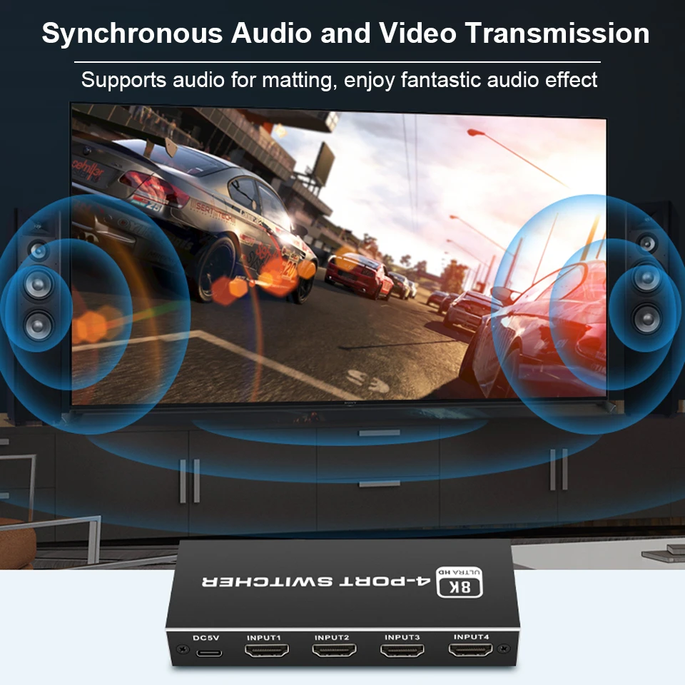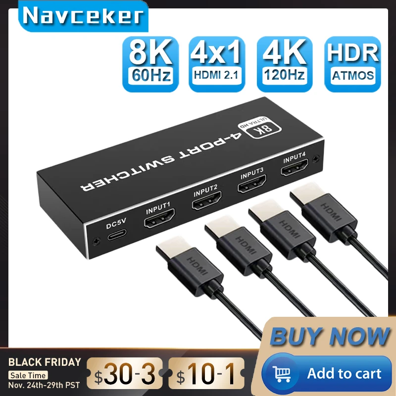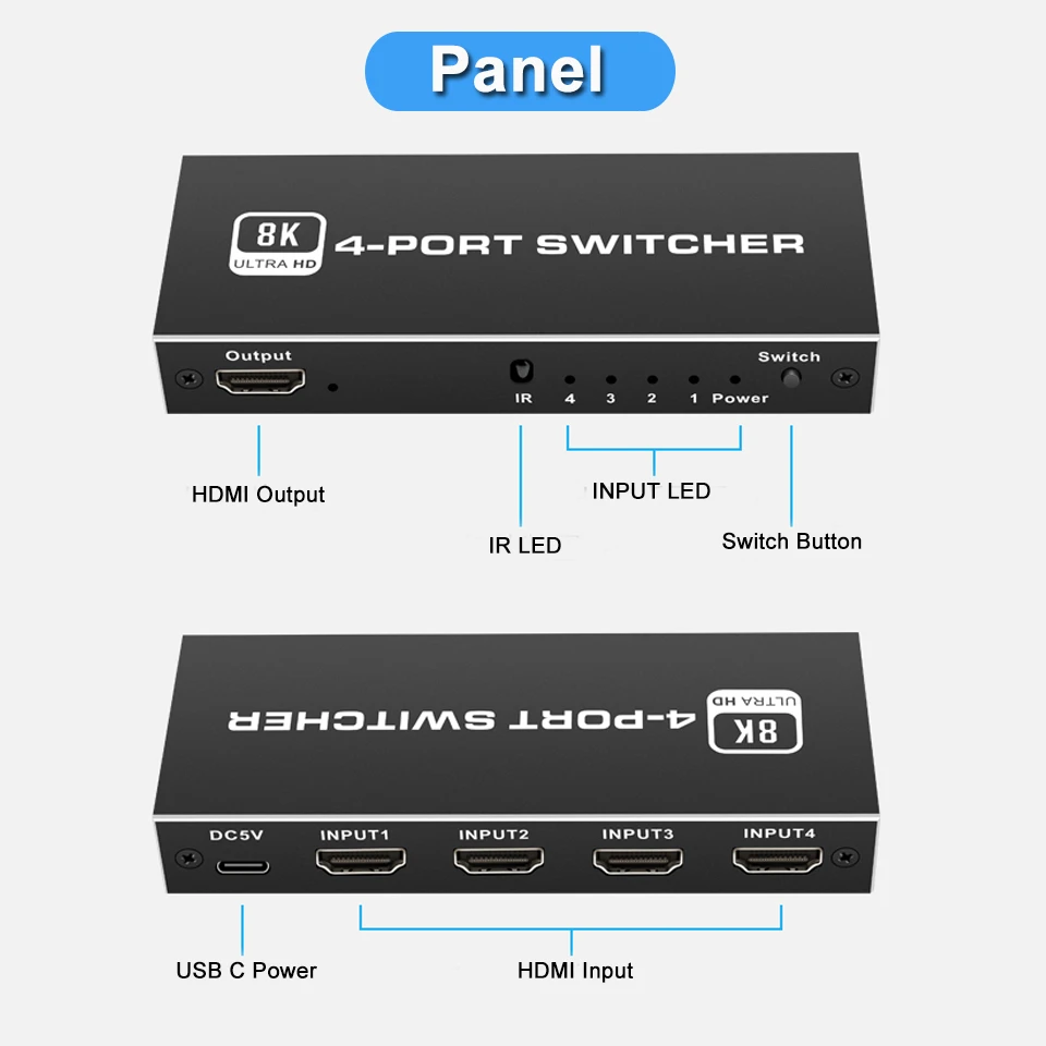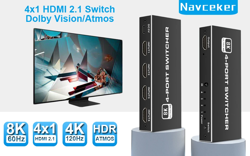 Navceker 8K @ 60Hz 4K @ 120Hz HDMI Switch puede conectar 4 fuentes HDMI como reproductor de blu-ray y PS3, PS4, PS4 Pro, PS5, etc. A una sola pantalla HDMI como HDTV. Y puede cambiar las fuentes HD muy convenientemente usando el control remoto IR o el botón de interruptor de clic fácil en la unidad. El sistema es compatible con HDMI 2,1, 3D y 8K Ultra HD.