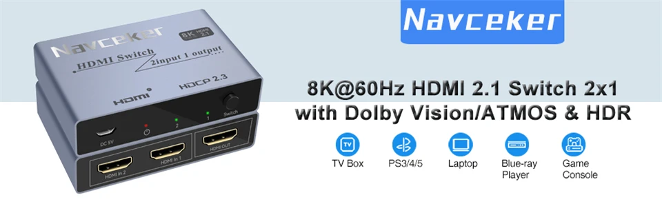 Navceker 8K @ 60Hz 4K @ 120Hz HDMI Switch puede conectar dos fuentes HDMI como reproductor de Blu-ray y PS3, PS4, PS4 Pro, PS5, etc. A una sola pantalla HDMI como HDTV.Y puede cambiar las fuentes HD muy convenientemente usando el botón de interruptor de clic fácil en la unidad. El sistema es compatible con HDMI 2,1, 3D y 8K Ultra HD.