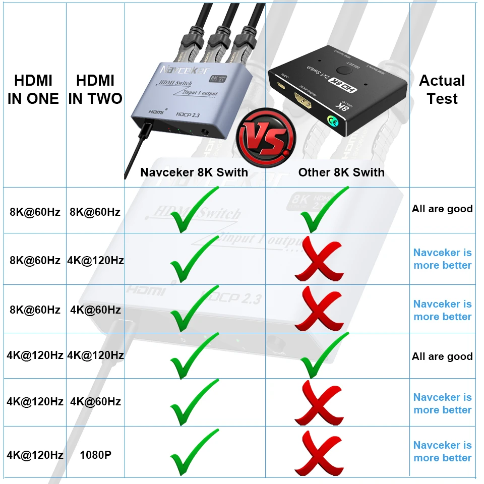 2: Si necesita usar el conmutador Navceker para emitir 4K @ 120Hz y 8K @ 60Hz, asegúrese de que su cable compatible con HDMI, la fuente de señal compatible con HDMI y la pantalla compatible con HDMI admiten la resolución anterior.