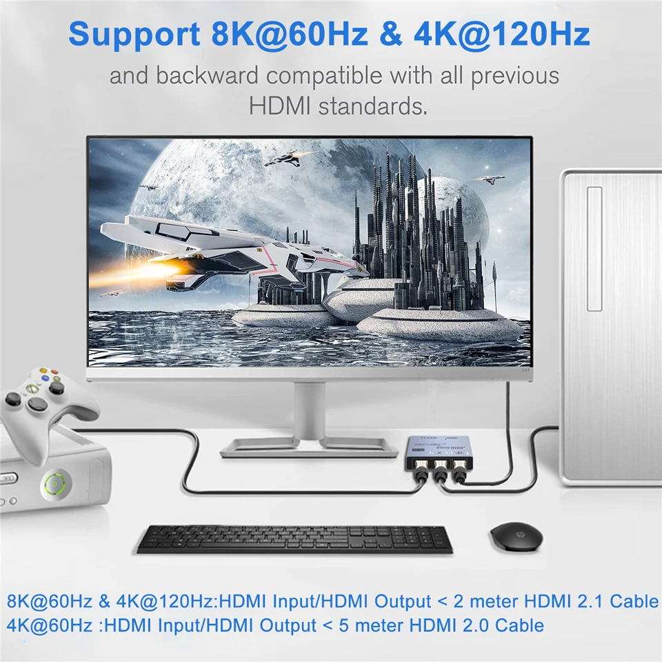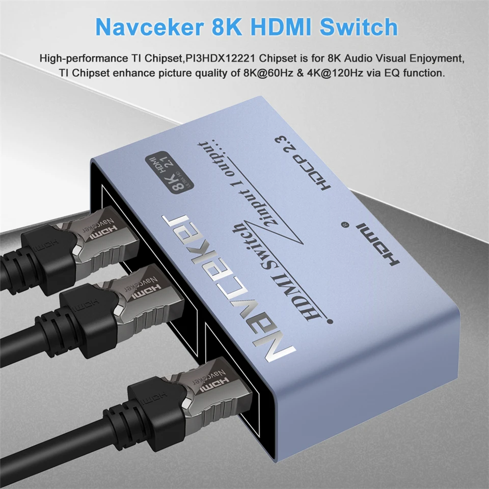 Navceker 8K @ 60Hz 4K @ 120Hz HDMI Switch puede conectar dos fuentes HDMI como reproductor de Blu-ray y PS3, PS4, PS4 Pro, PS5, etc. A una sola pantalla HDMI como HDTV.Y puede cambiar las fuentes HD muy convenientemente usando el botón de interruptor de clic fácil en la unidad. El sistema es compatible con HDMI 2,1, 3D y 8K Ultra HD.