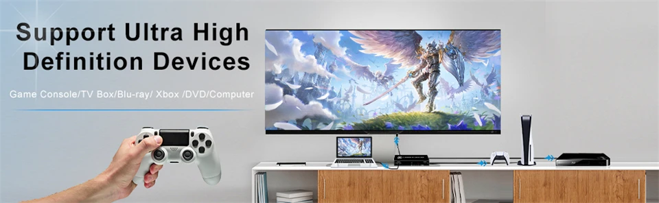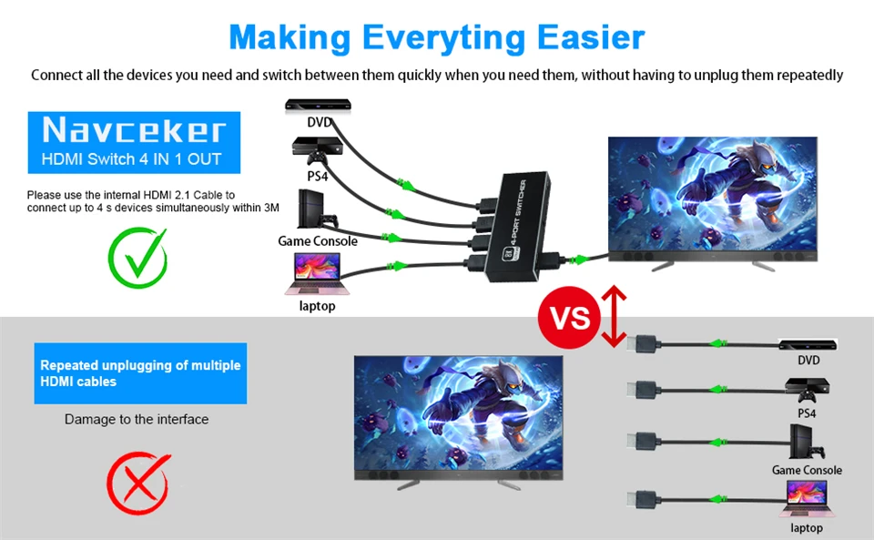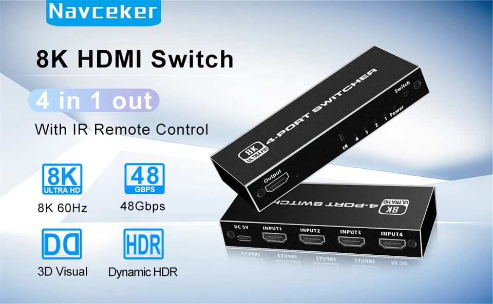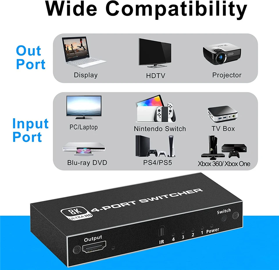 El interruptor HDMI Navceker 8K @ 60Hz 4K @ 120Hz puede conectar cuatro fuentes HDMI como reproductor de Blu-ray y PS3, PS4, PS4 Pro, PS5, etc. A una sola pantalla HDMI como HDTV. Y puede cambiar las fuentes HD muy convenientemente usando el control remoto IR o el botón de interruptor de clic fácil en la unidad. El sistema es compatible con HDMI 2,1, 3D y 8K Ultra HD.