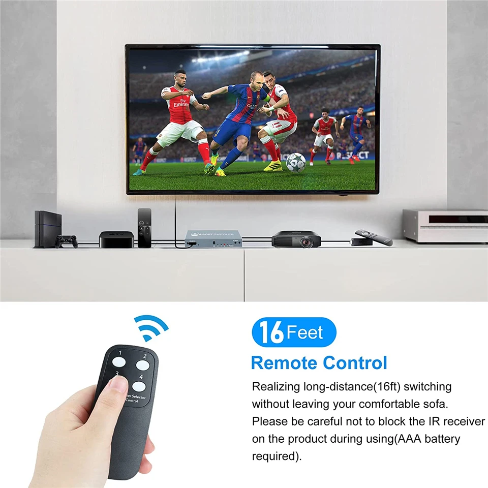 FÁCIL DE ENGANCHAR: este interruptor HDMI alimentado admite la función de conmutación de teclas y control remoto, use el control remoto para liberar sus manos. Los indicadores LED le dicen qué puerto está activo. Se puede alimentar para hacer que su transmisión de señal sea más estable. Plug & Play. Es ideal para ferias comerciales, salas de conferencias, salas de cama, salas de estar, cocinas y patios traseros.