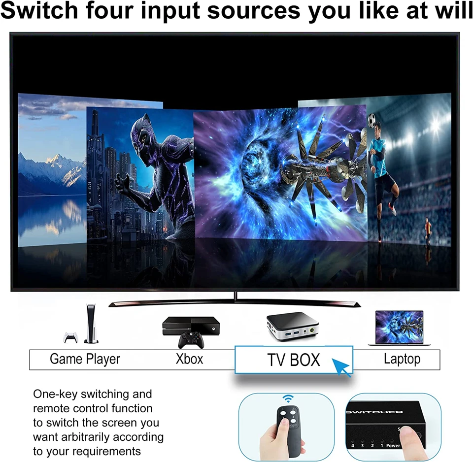 HDMI 2,1 HDMI SWITCH 4 IN 1 OUT : 4 puertos HDMI de entrada y 1 salida HDMI para varios dispositivos HDMI, el conmutador HDMI 4 puertos puede funcionar con la mayoría de los dispositivos con interfaz HDMI estándar. Entrada: PC, ordenadores portátiles, Xbox 360, PS3/PS4/PS5, Roku Express, Amazon Fire TV Stick, Blu-ray DVD, etc. Salida: televisores Full HD, proyectores, monitores y más.