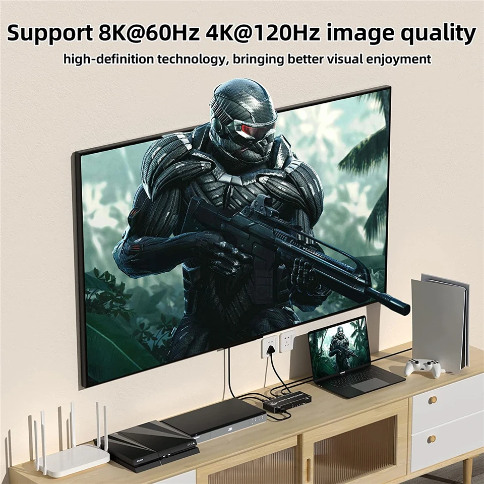 El interruptor HDMI Navceker 8K @ 60Hz 4K @ 120Hz puede conectar cuatro fuentes HDMI como reproductor de Blu-ray y PS3, PS4, PS4 Pro, PS5, etc. A una sola pantalla HDMI como HDTV. Y puede cambiar las fuentes HD muy convenientemente usando el control remoto IR o el botón de interruptor de clic fácil en la unidad. El sistema es compatible con HDMI 2,1, 3D y 8K Ultra HD.