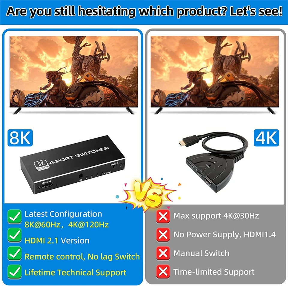 Consejos cálidos: 1)🔥Al conectarse a la fuente o a la pantalla, se recomienda encarecidamente utilizar una fuente de alimentación con un cable Micro USB de un adaptador de corriente USB de 5V para un mejor rendimiento. 2)🔥Para una resolución de 8K, la longitud de los cables HDMI conectados a ambos extremos del interruptor no debe exceder los 3 metros respectivamente. 3)🔥Si necesita salida 8K @ 60Hz y 4K @ 120Hz, le recomendamos que utilice un cable estándar HDMI 2,1 de alta calidad, ¡Comparta el vídeo y el audio más lujosos!