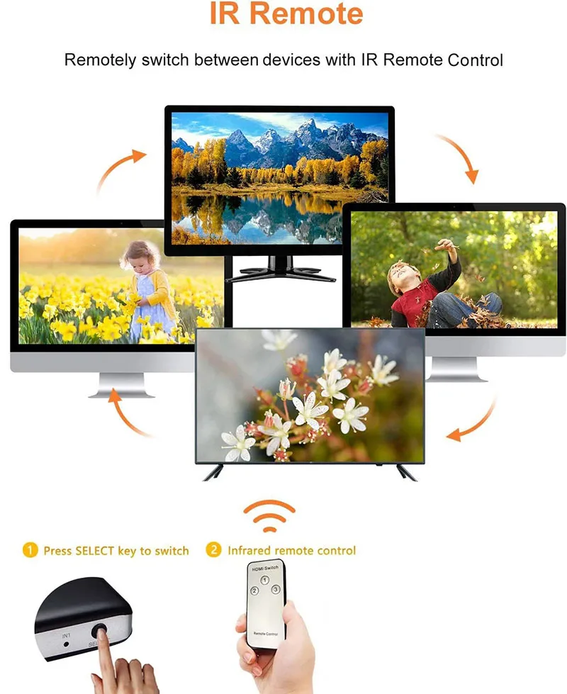 Este interruptor HDMI de 3 puertos permite cambiar 3 puertos HDMI a un solo terminal de pantalla a través del control remoto o
