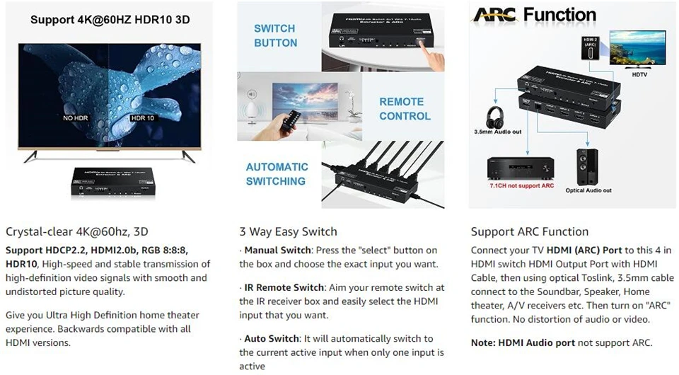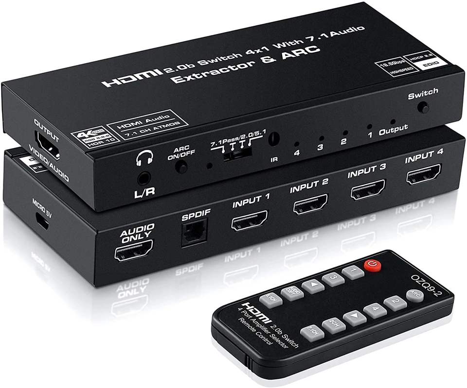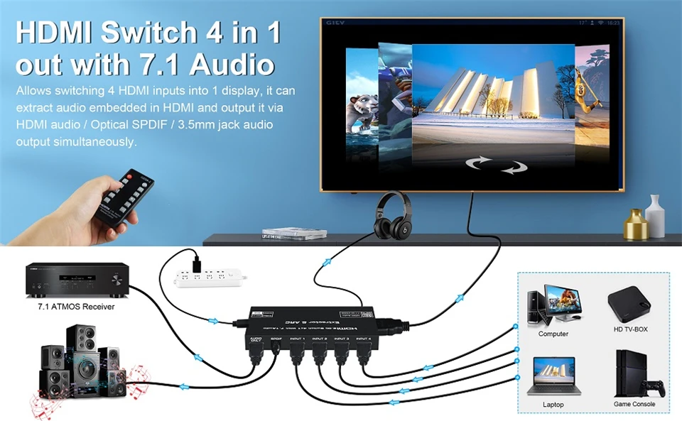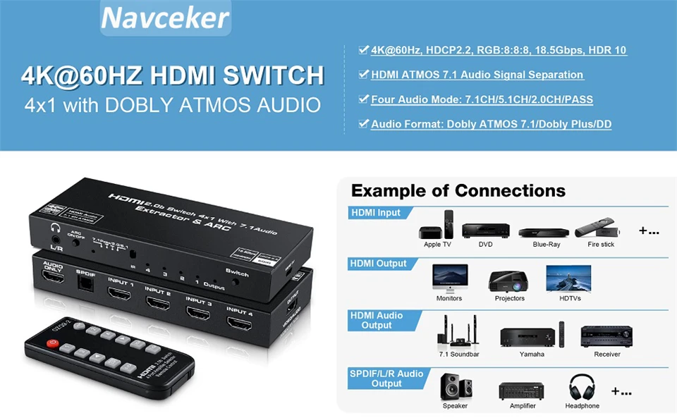 El conmutador HDMI Navceker 4x1 con extractor de audio puede conectar hasta 4 fuentes HD a 1 pantalla HDMI y extrae audio de la señal HDMI 4K al audio HDMI 7,1 atmos, fibra óptica o audio estéreo y envíelo a un altavoz o barra de sonido externa.