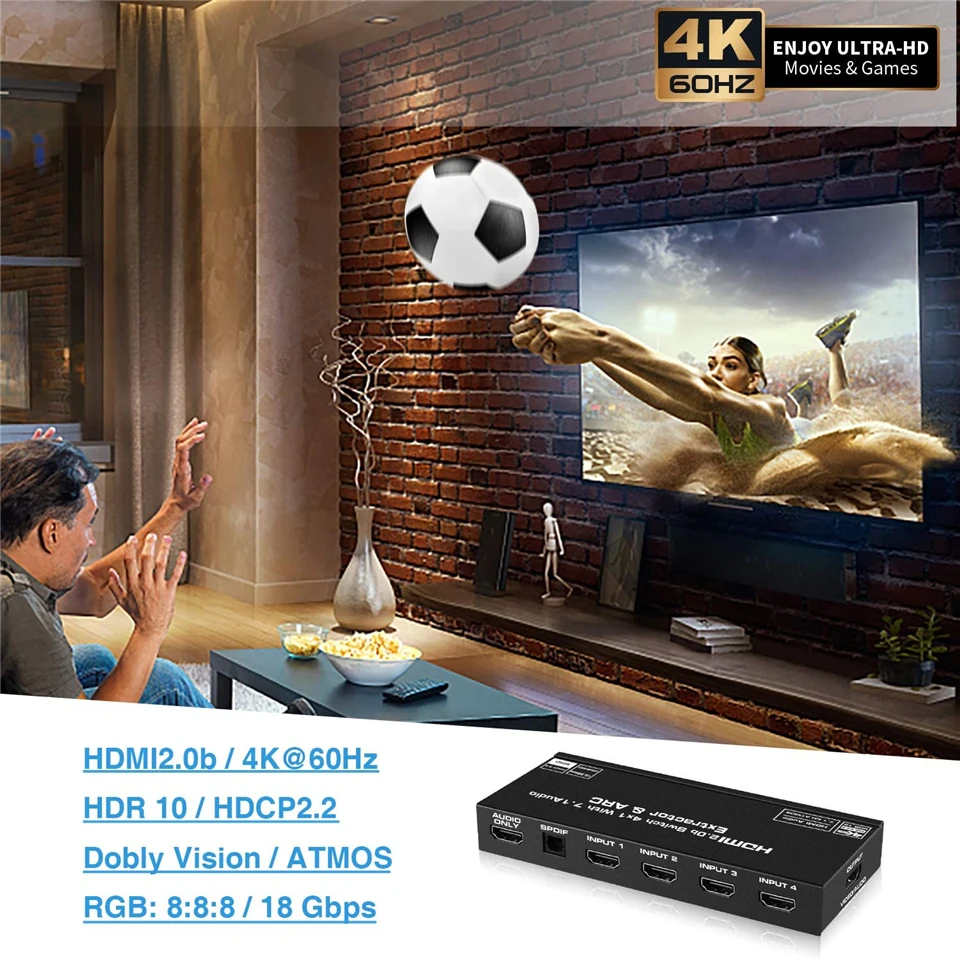 Conmutador HDMI 4K@60Hz Salida 4 en 1 con audio HDMI (ATMOS 7,1 canales)/Extrator de audio óptico SPDIF/3.5