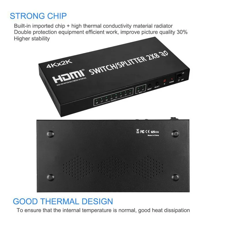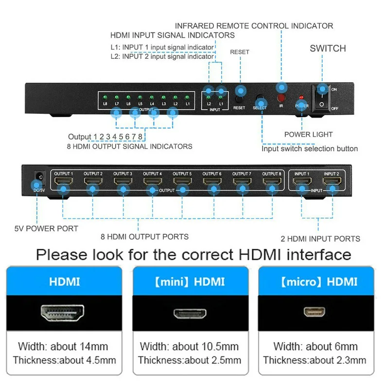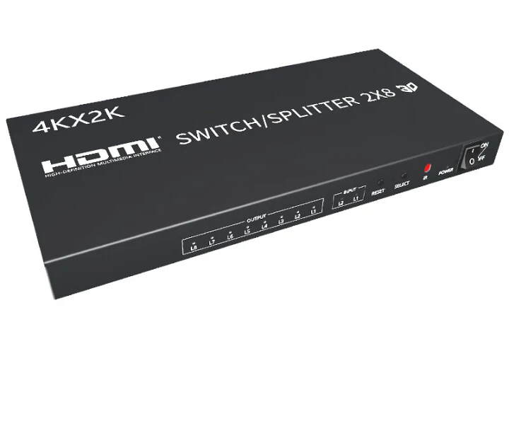 El divisor conmutador HDMI 2x8 puede conectar dos fuentes de señal HD con dos terminales de pantalla HD, permite dividir o cambiar dos señales HDMI a dos monitores o proyectores compatibles con HDMI.