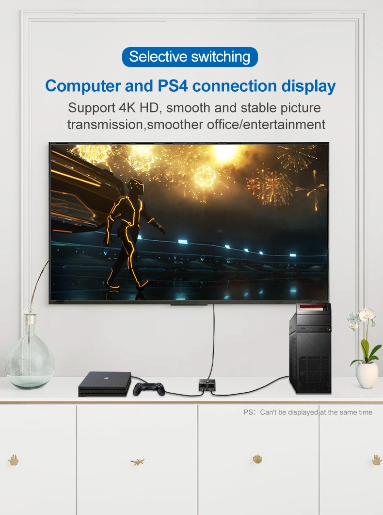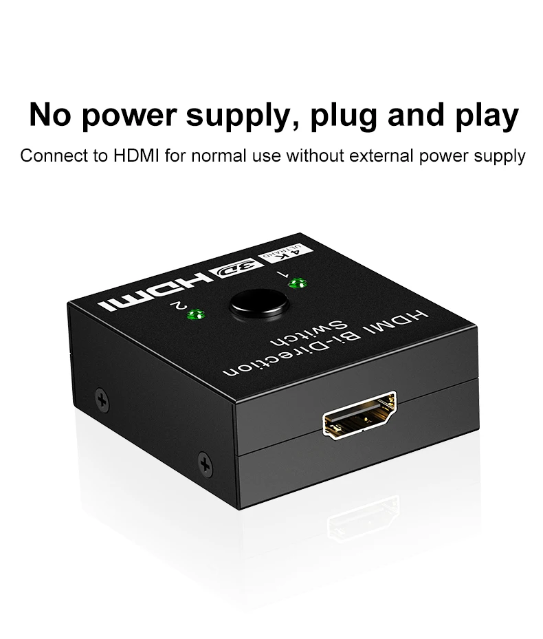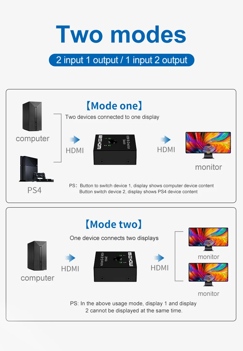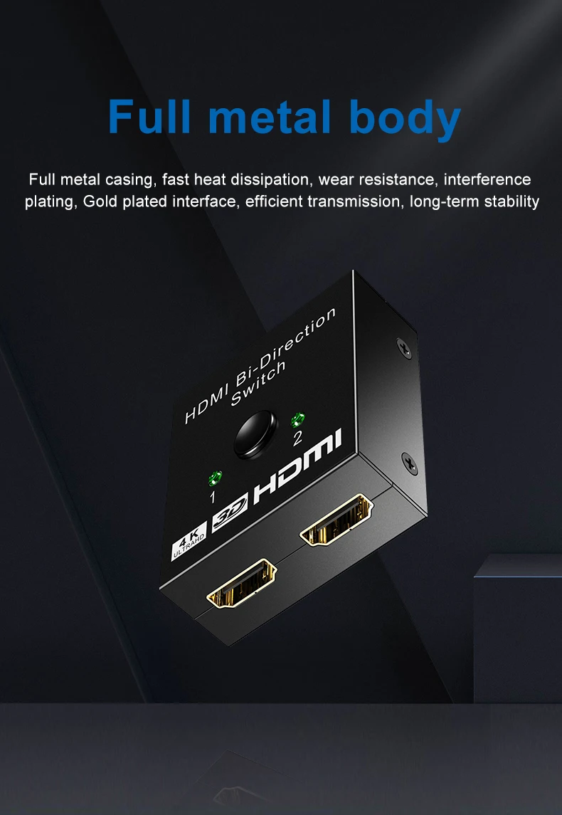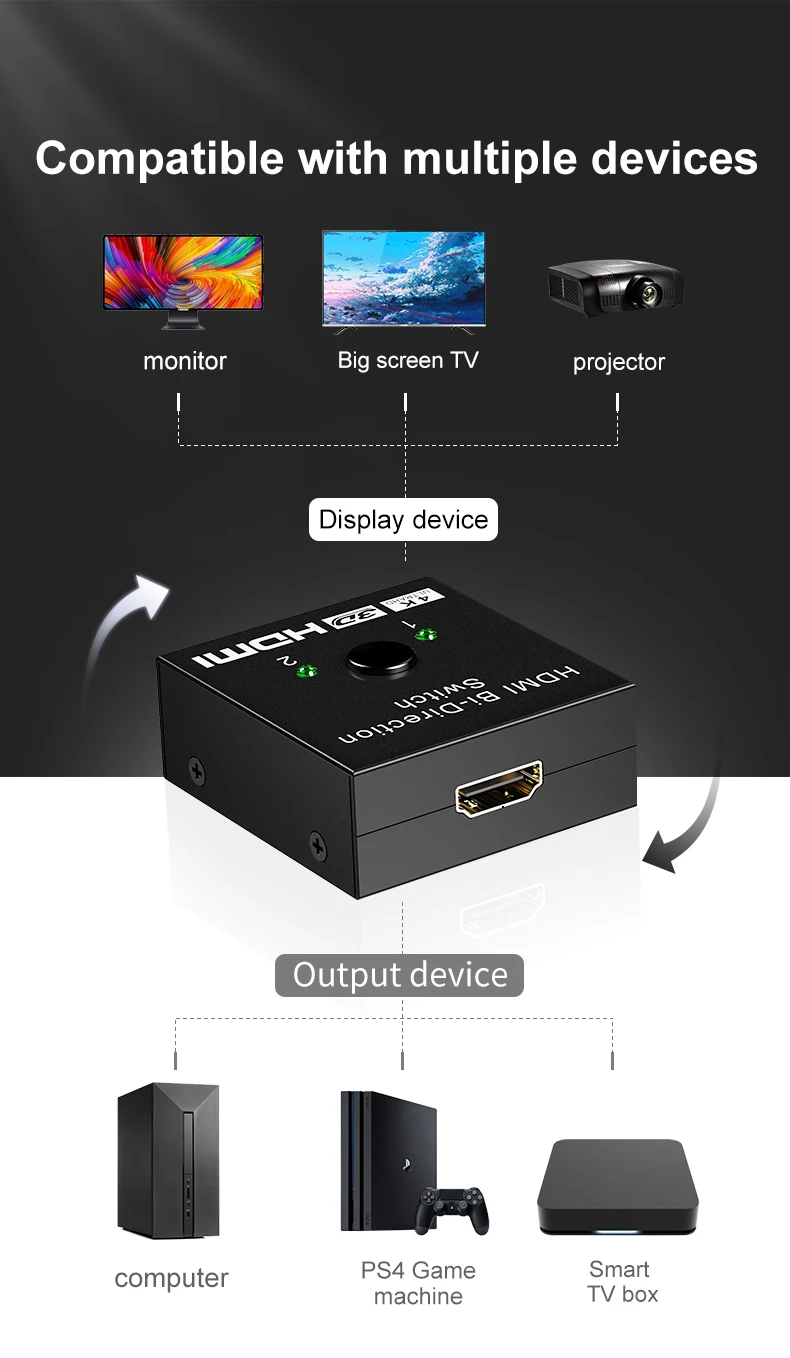 Este es un dispositivo de conmutador manual bidireccional HDMI de 2 puertos. Puede cambiar fácilmente dos rutas de fuente HD a cualquier pantalla o proyector HD. También puede distribuir una fuente HD a dos pantallas o proyectores HD.