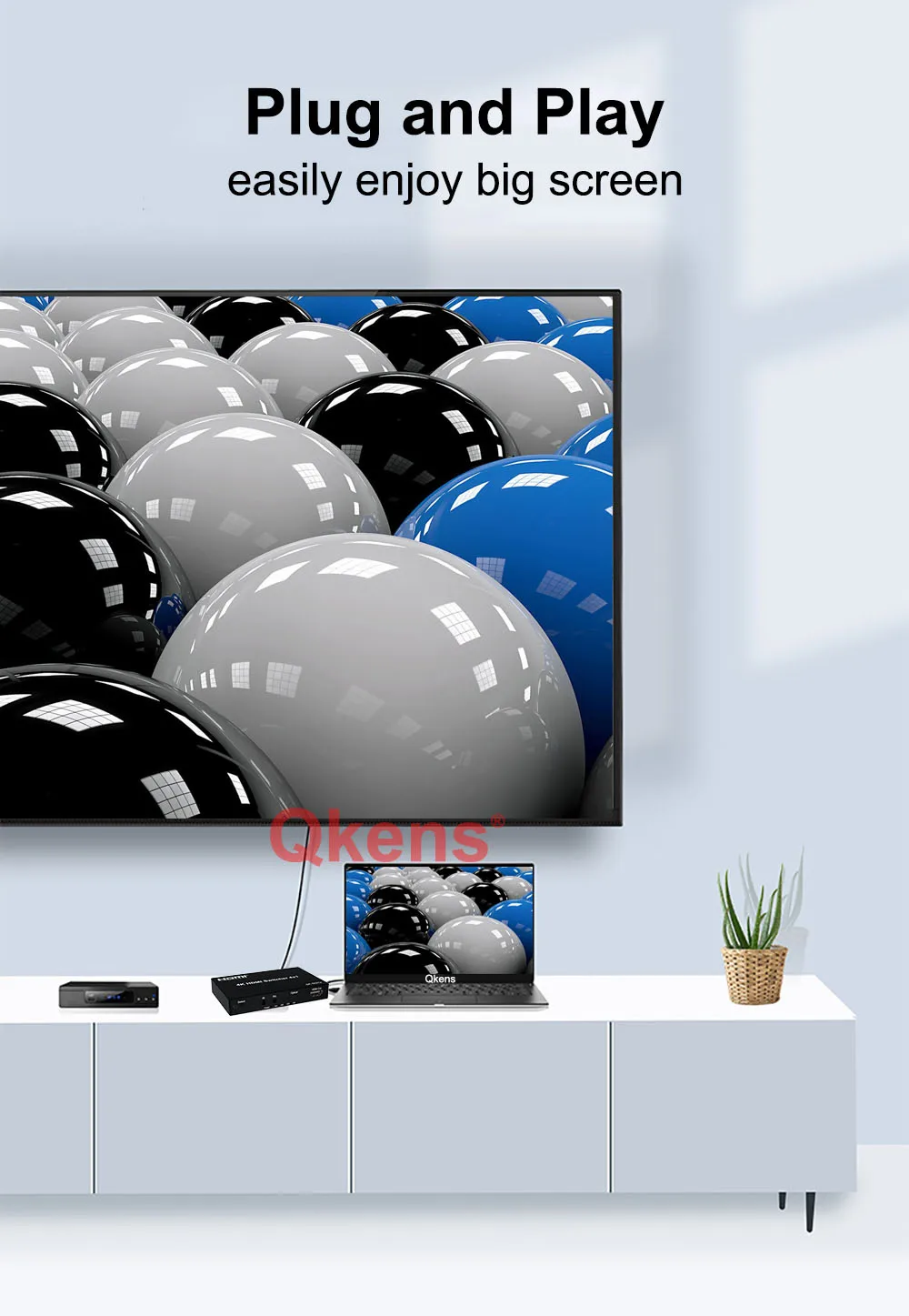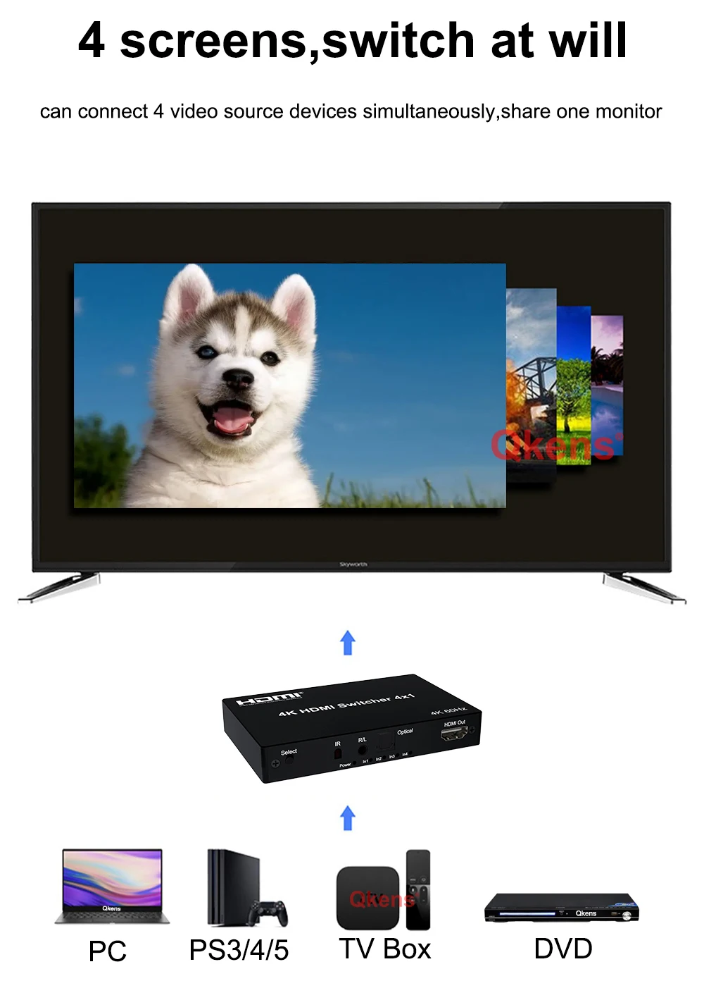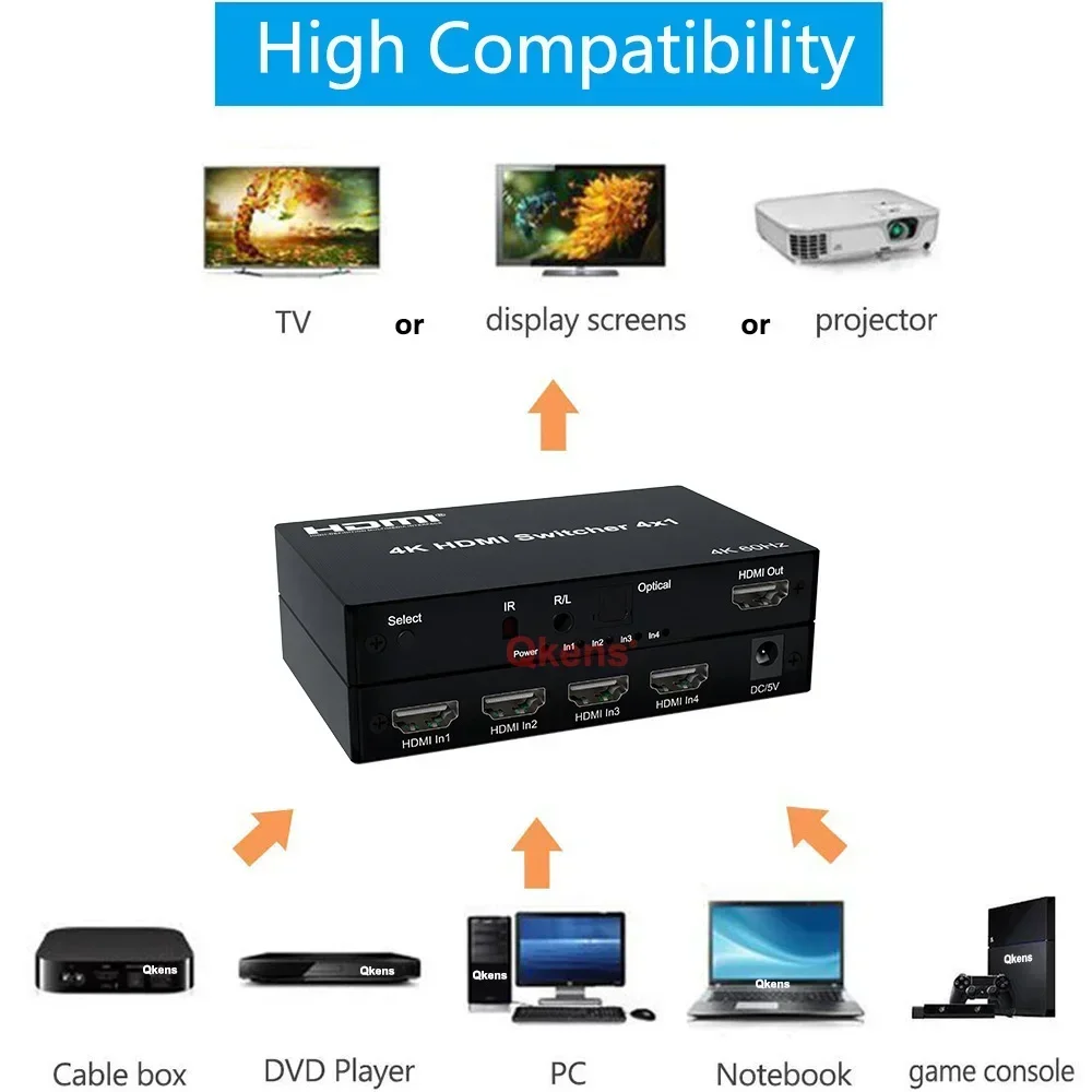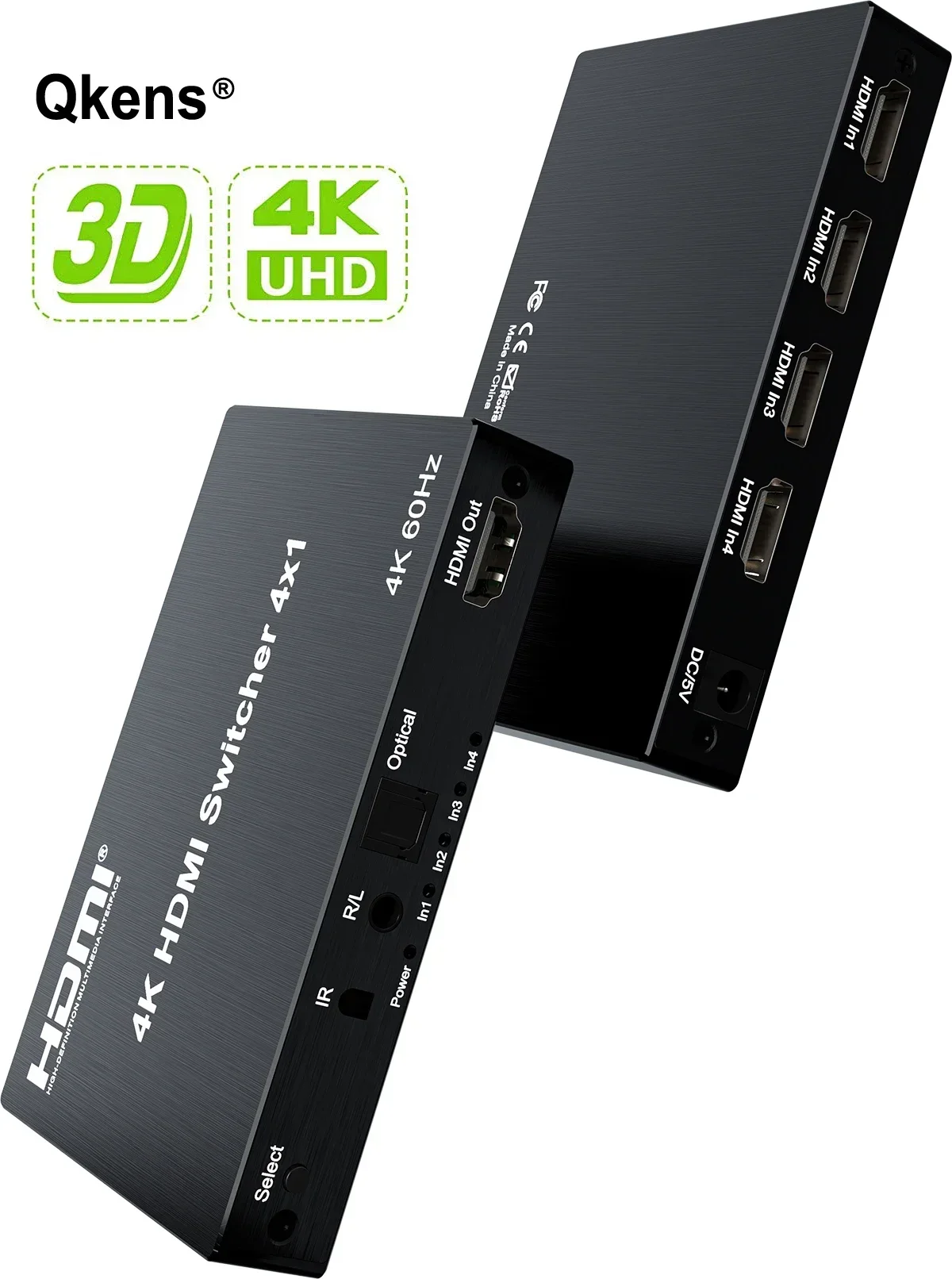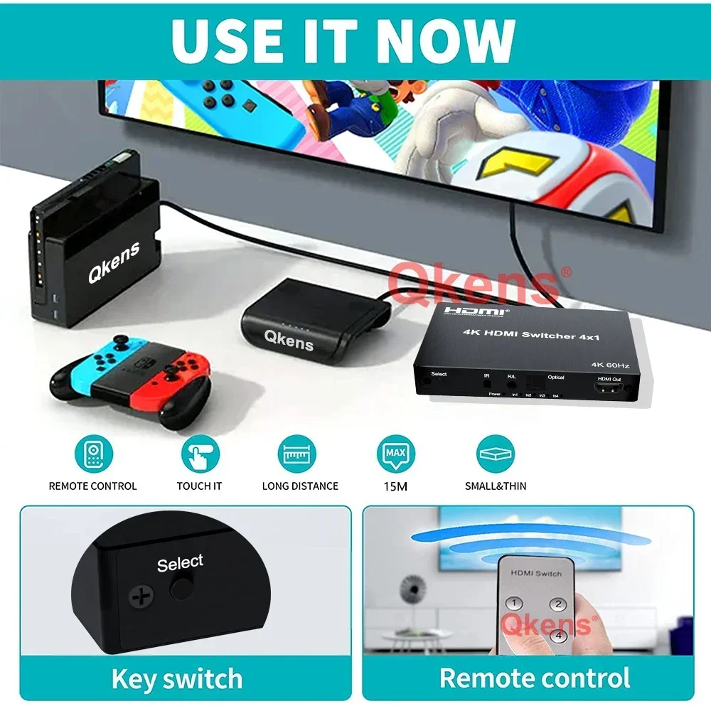 Este conmutador HDMI Qkens 4x1 permite cambiar 4 puertos HDMI a un único terminal de pantalla mediante control remoto