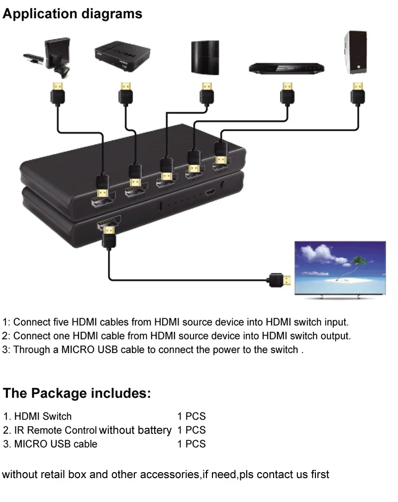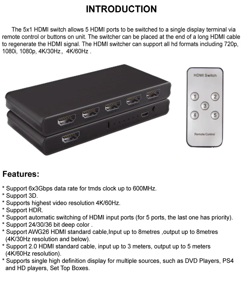 Conmutador HDMI 4K 60HZ 5x1, convertidor de vídeo conmutador 2,0, 5 en 1, salida 1080p, HDR 3D para PS3, PS4, XBOX, TV Box, PC a proyector de Monitor de TV